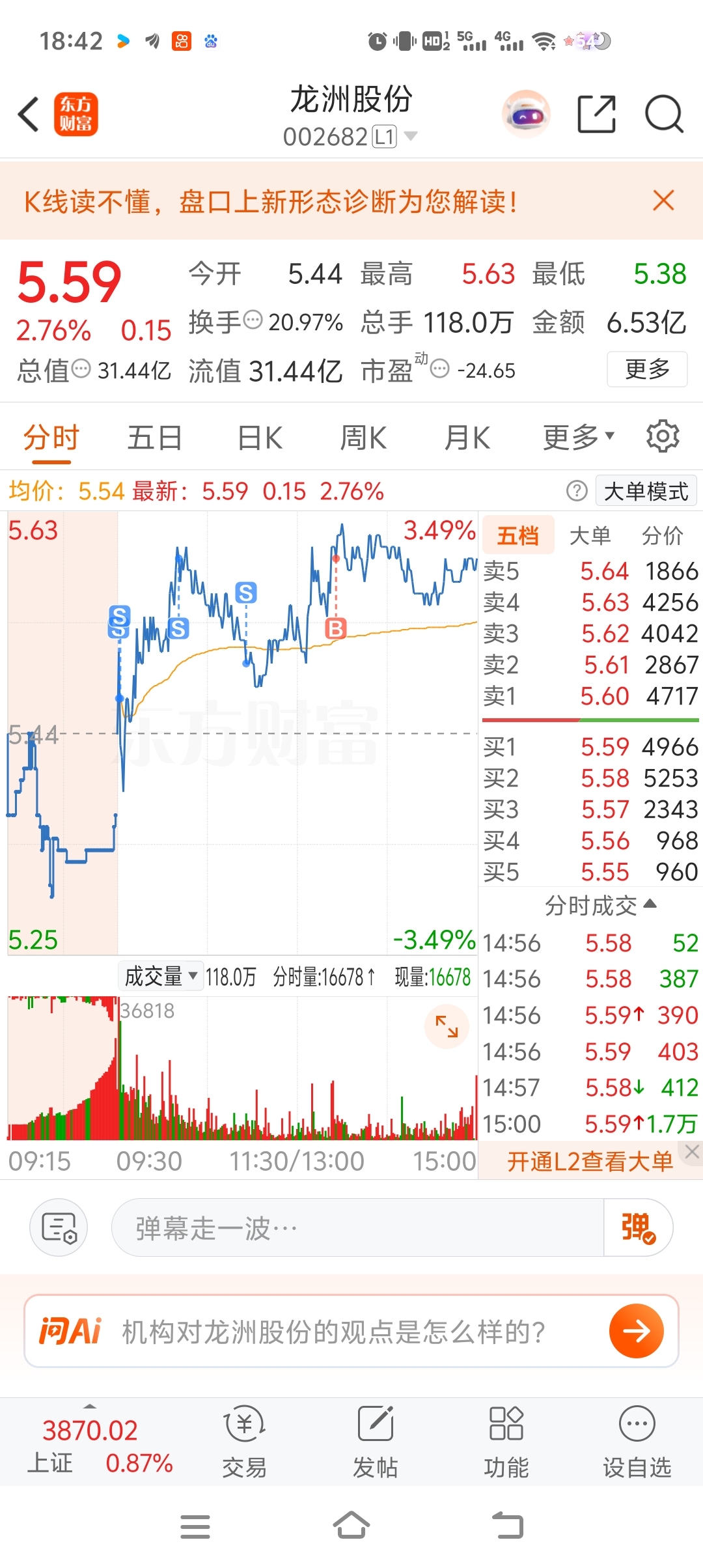 昨天满仓吸的龙洲,今天全走了,下午买回来一层仓,晚上一看公告,真牛,这股票真心玩