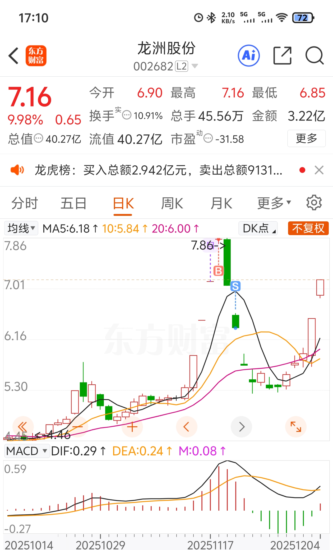$龙洲股份(SZ002682)$ 打板挨的打,当天一字第二天直接A杀,给我上了一课,大家注意这个股票,说A就A注意风控