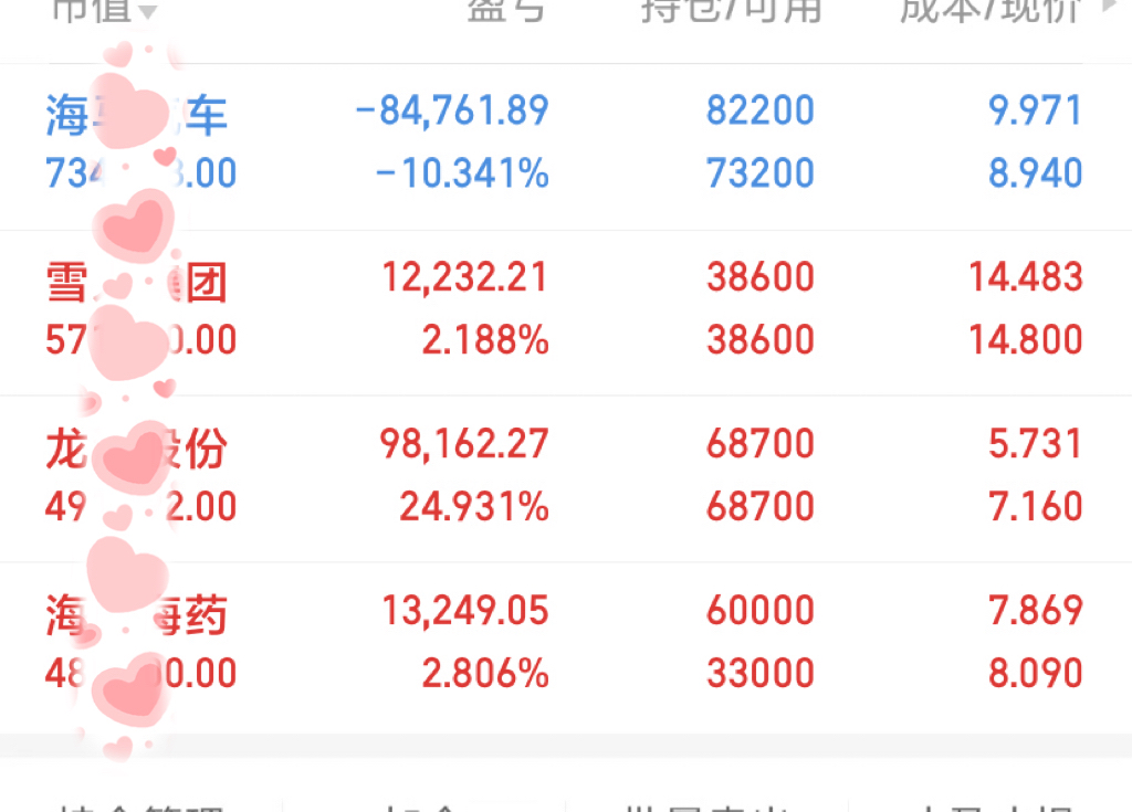 操作上,仓位保持灵活配置,雪人、龙洲锁仓中,海马水下补仓部分,海药水下补仓盘中做以T。暂时三红一绿,存量市场博弈,不建议频繁换股调仓,容易两头挨打,多耐心些等待轮动反弹。操作具体尊循市场,顺势而为,灵活运用。以上属个人观点及分析仅供参考。