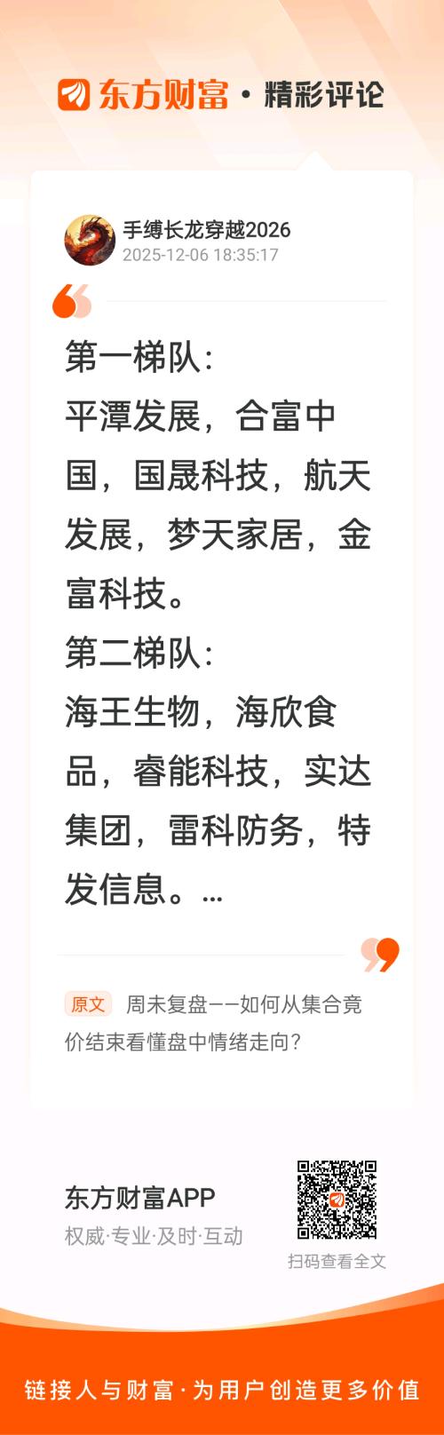 一,我们先看万众瞩目的摩尔上市!从逻辑来说,大利好会带动摩尔系走出一大波(初灵,华而t,联美,盈趣,大众),周四是联美最先涨停上板的,然后是华而,初灵,盈趣,大众,这几个至少得有一个顶一字板,或者两个大幅高开,才符合预期!可是周五竟价结束,联美平开,华而低开,从情绪来说,叫严重不符合预期,结合量化砸盘的手法,预防利好兑现就是利空!这几个票就不能去了!从盘后来看,华r泰被砸跌停,就是这个原因!那周一,得看反向操作,因为摩尔的热度还在,仍可留意上面几个断板反包的机会!