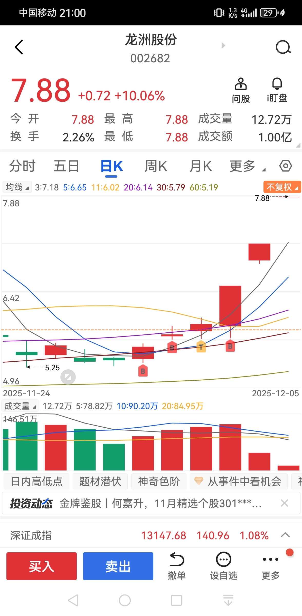 $龙洲股份(SZ002682)$ 明天继续顶一字吗?35号利润了