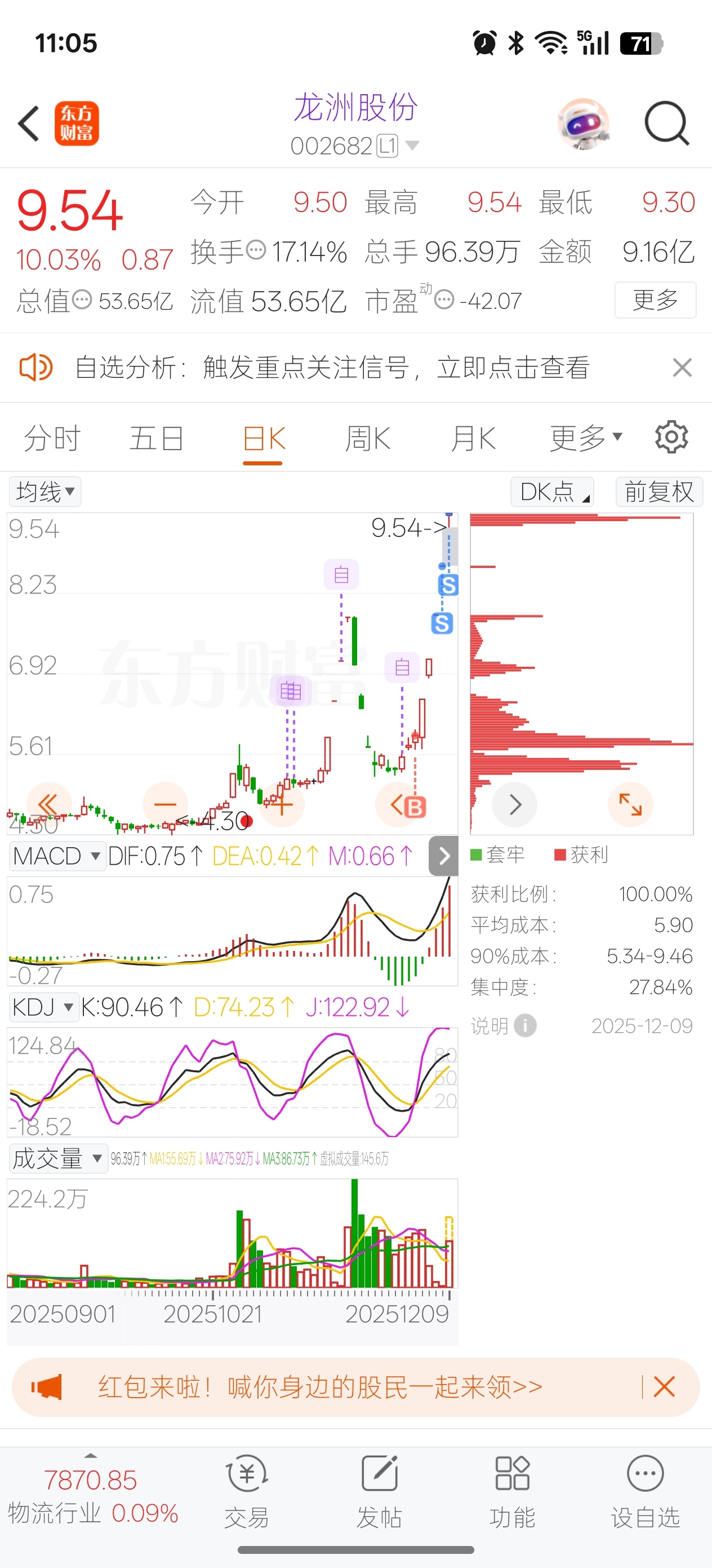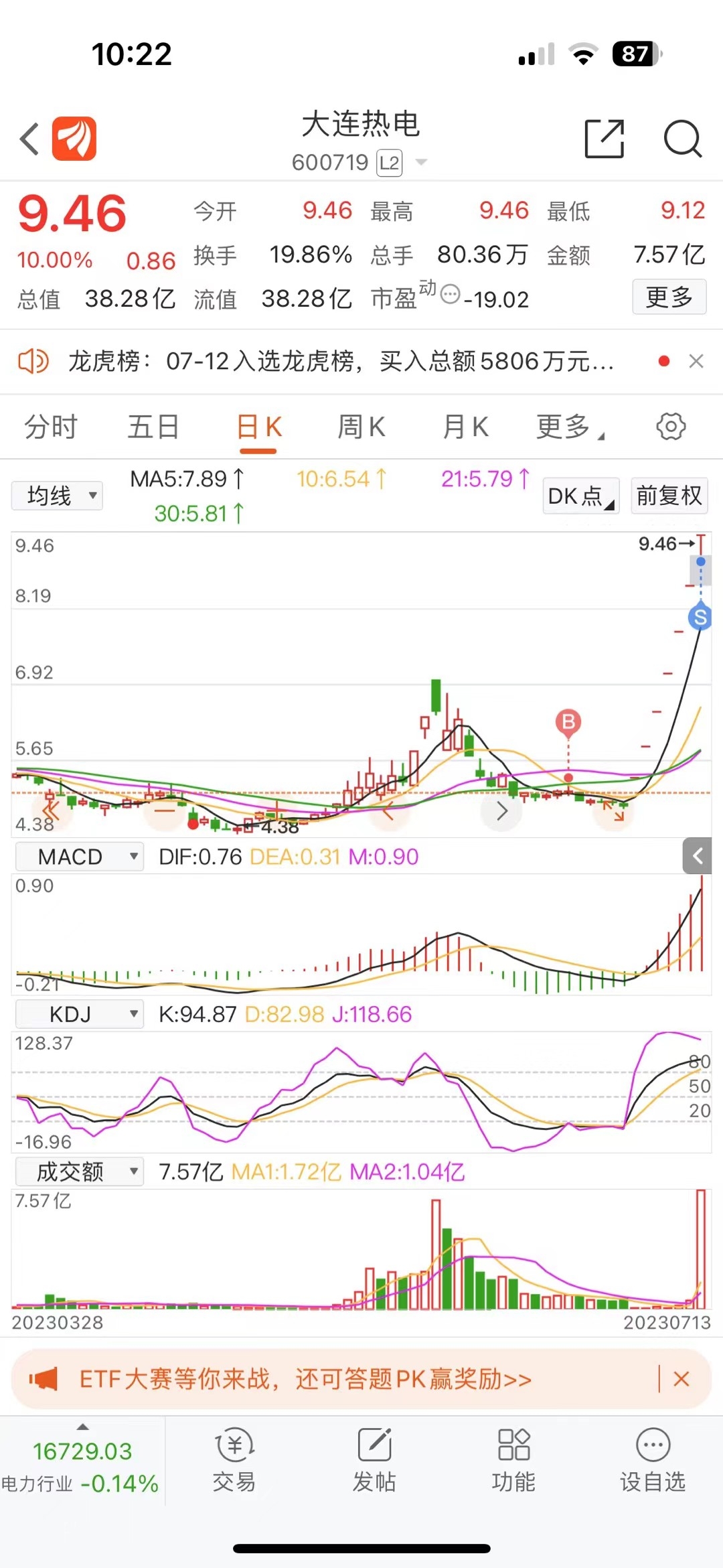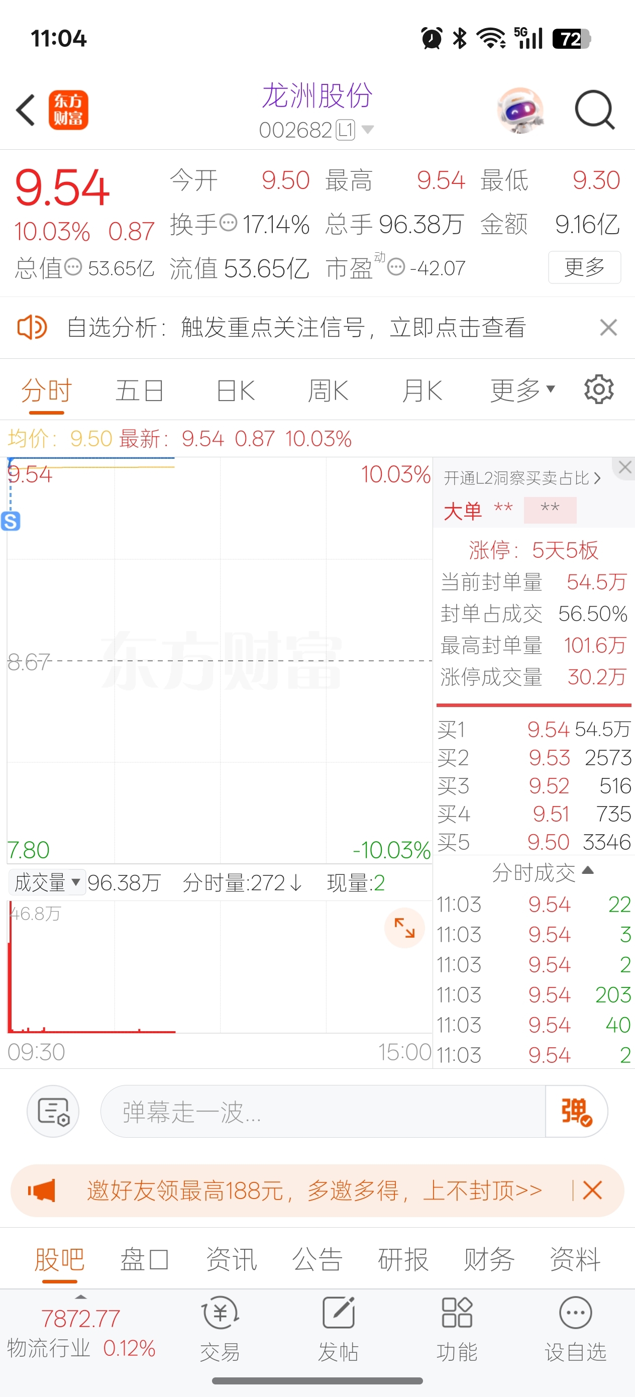 (SZ002682)$ 吃了5个板,卖飞了,可能跟我之前大连一样7个板