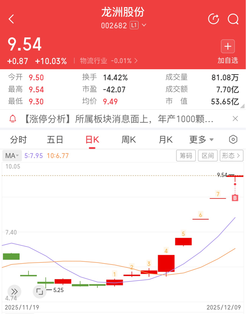 今天从航天发展切到龙洲股份了,来这里和大家一起吃大肉