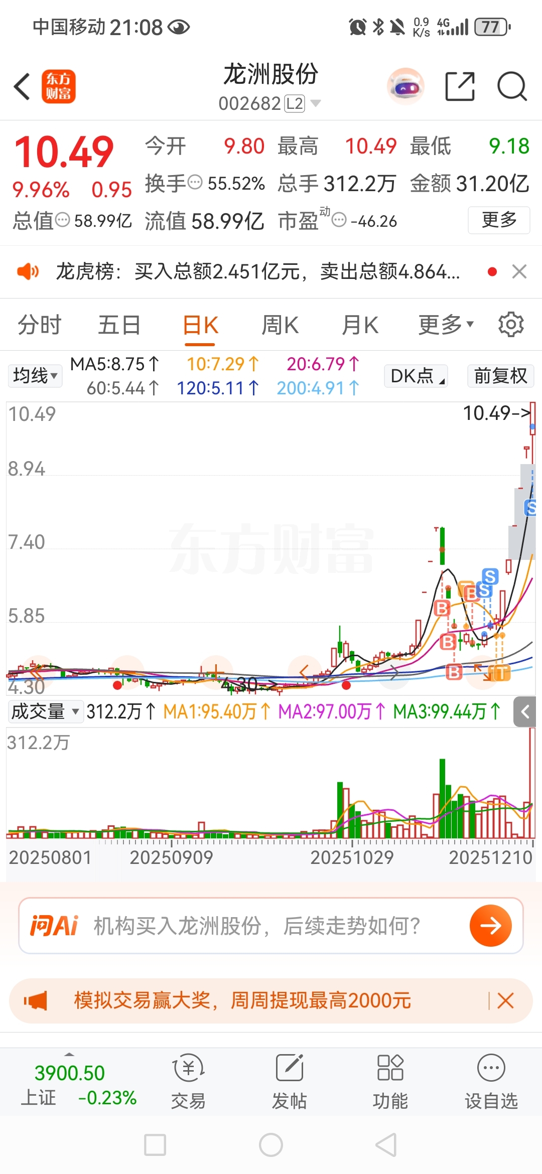 $龙洲股份(SZ002682)$ 卖飞太多了,从亏1.5万到赚3万离场,原计划今天格局到尾盘的,被吓出去了