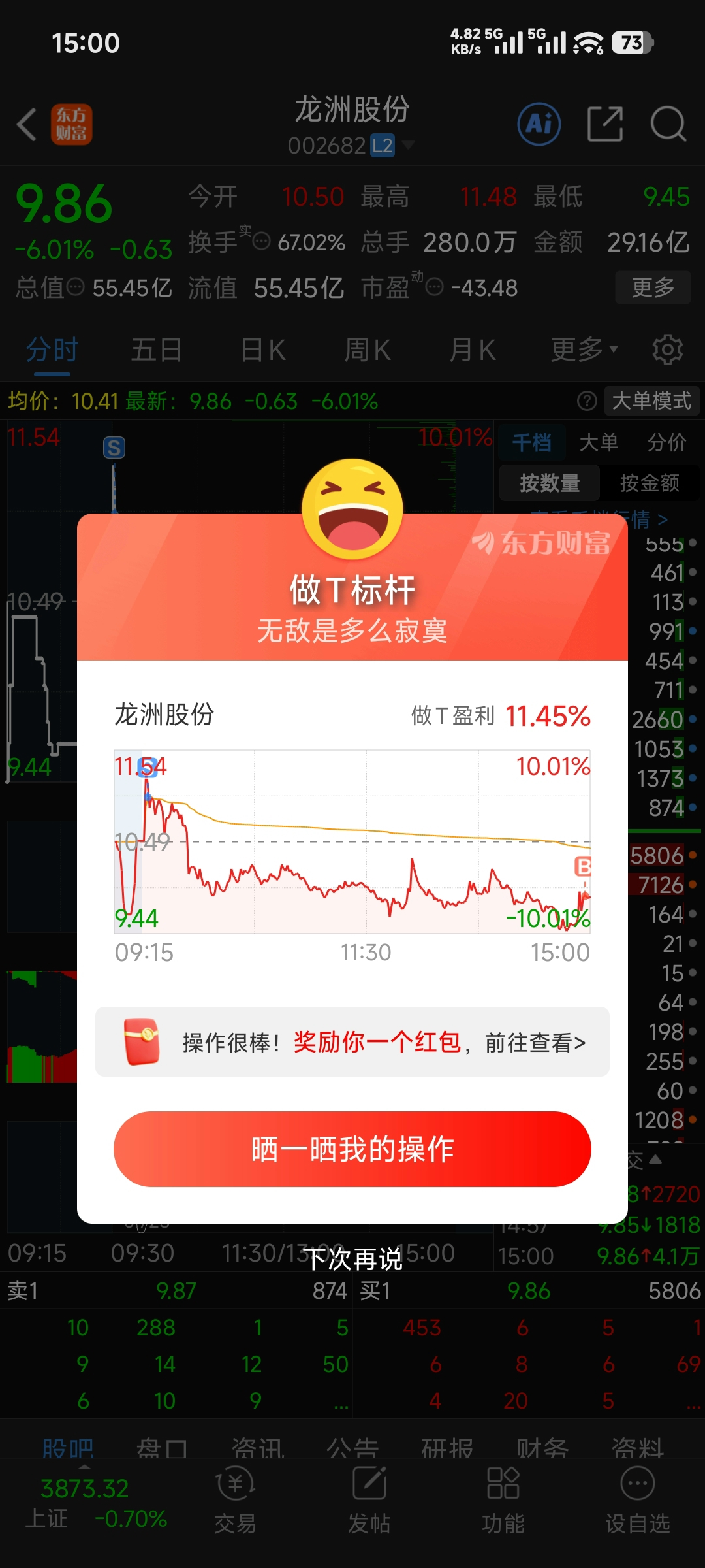 $龙洲股份(SZ002682)$ 有没有做T的小伙伴们,今天想让他跌停,反而不跌停。最后突然拉起来了。买回来做个T,明天及时跌停,也是保本。#炒股日记#