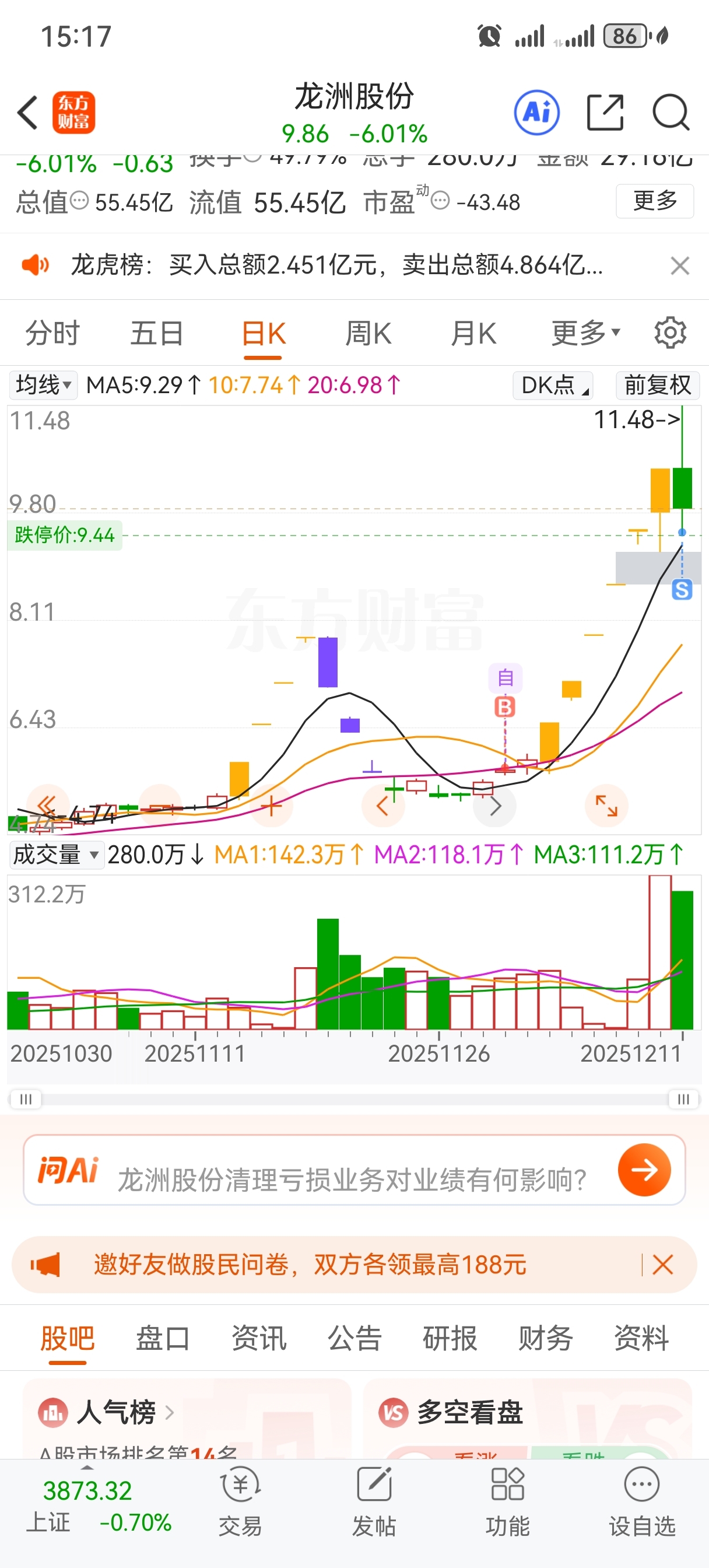 $龙洲股份(SZ002682)$ 今天没有操作好,少赚一个涨停