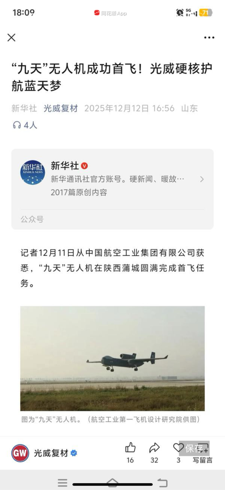 下周爆发的机会~光威复材~正宗核聚变+商业航天+九天无人机独加隐身材料