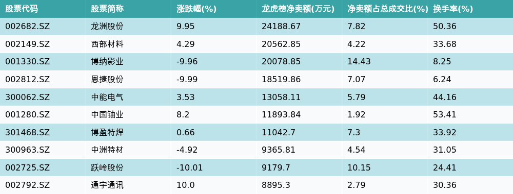 南财智讯12月15日电,南财金融终端数据显示,因当日异动登上龙虎榜的个股中,龙虎榜中资金净流出最多的前三位分别是龙洲股份(002682.SZ)、西部材料(002149.SZ)与博纳影业(001330.SZ)。其中排名第一的龙洲股份被净卖出2.42亿元,占总成交金额的7.82%。龙洲股份收盘上涨9.95%,换手率为50.36%。净卖出额前10个股详情见下图: