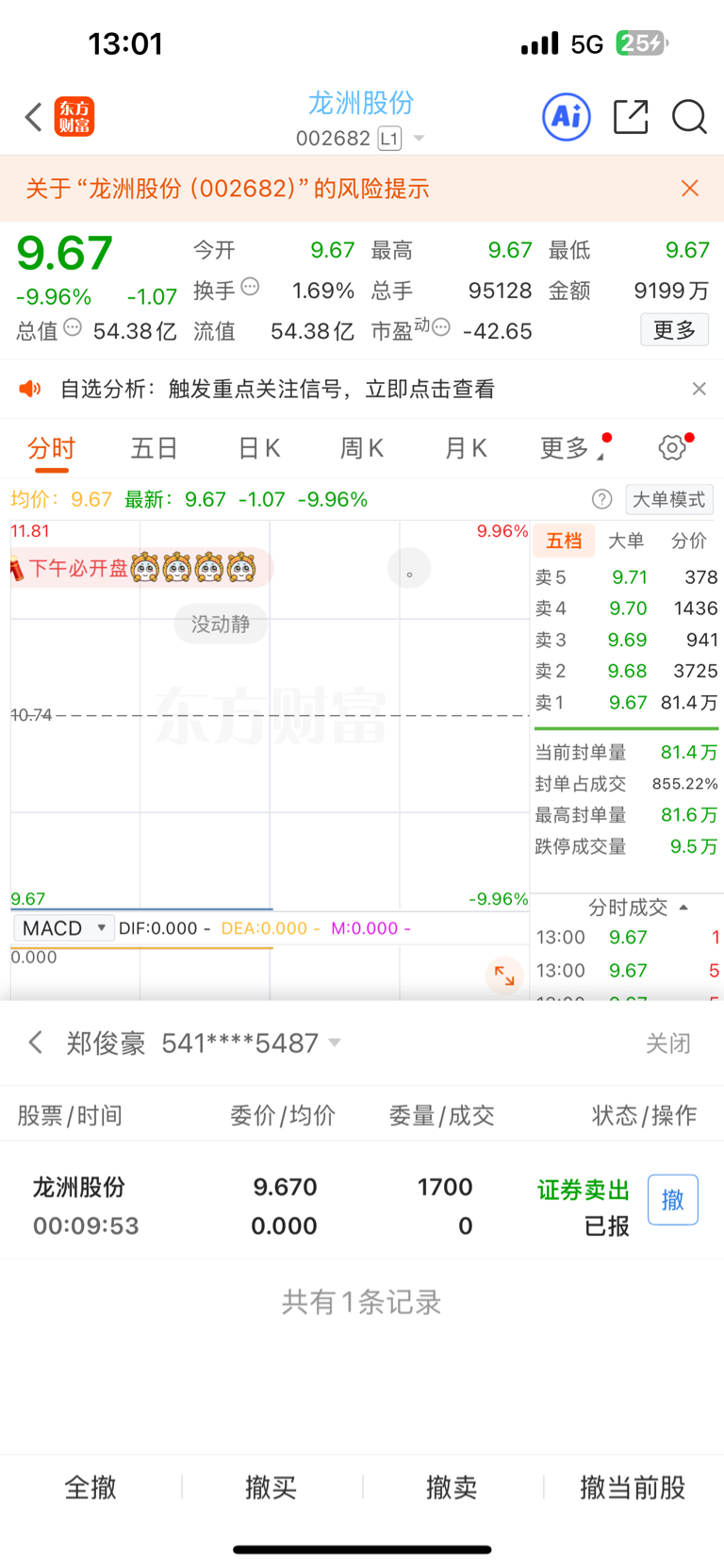 $龙洲股份(SZ002682)$ 凌晨排的队到现在都卖不出去
