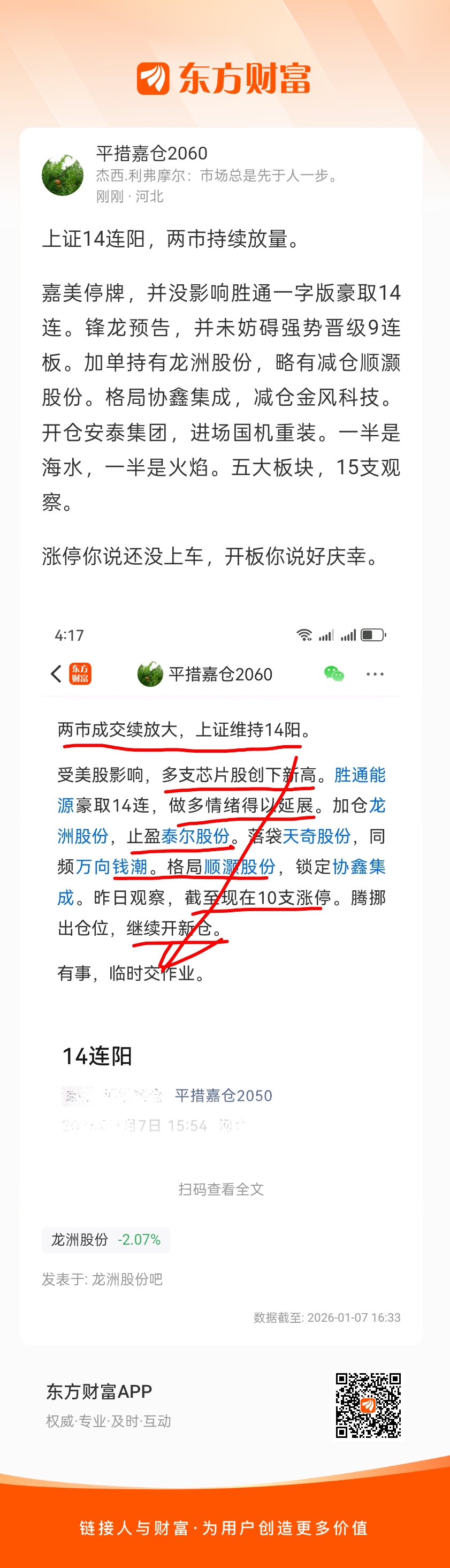 嘉美停牌,并没影响胜通一字版豪取14连。锋龙预告,并未妨碍强势晋级9连板。加单持有龙洲股份,略有减仓顺灏股份。格局协鑫集成,减仓金风科技。开仓安泰集团,进场国机重装。一半是海水,一半是火焰。五大板块,15支观察。
