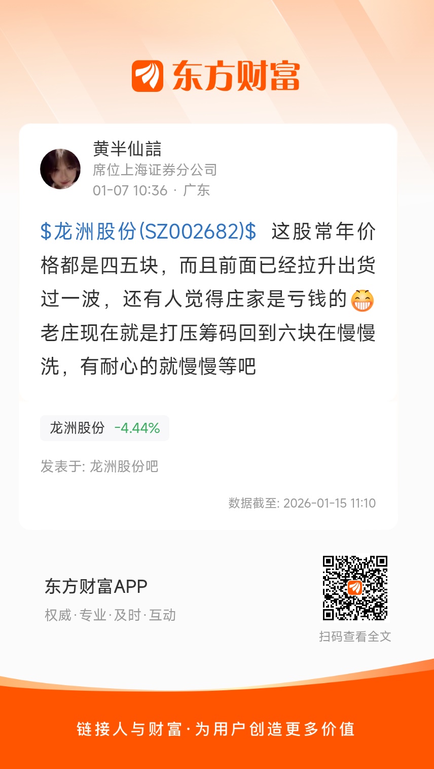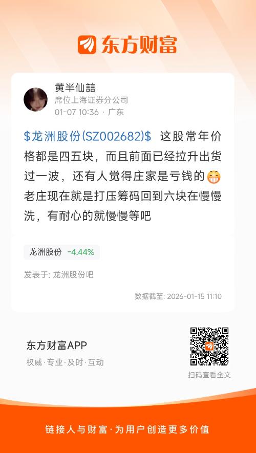 $龙洲股份(SZ002682)$ 这股常年价格都是四五块,而且前面已经拉升出货过一波,还有人觉得庄家是亏钱的