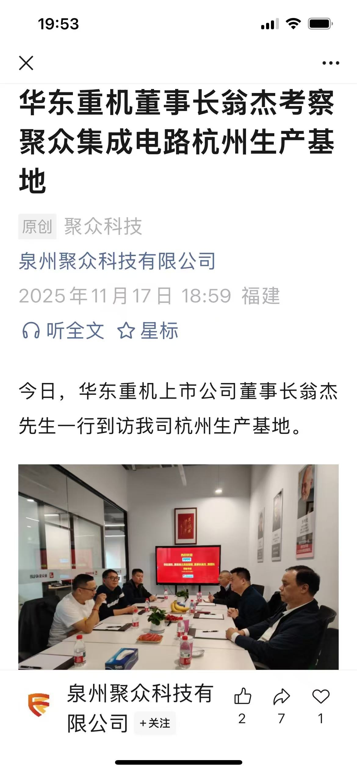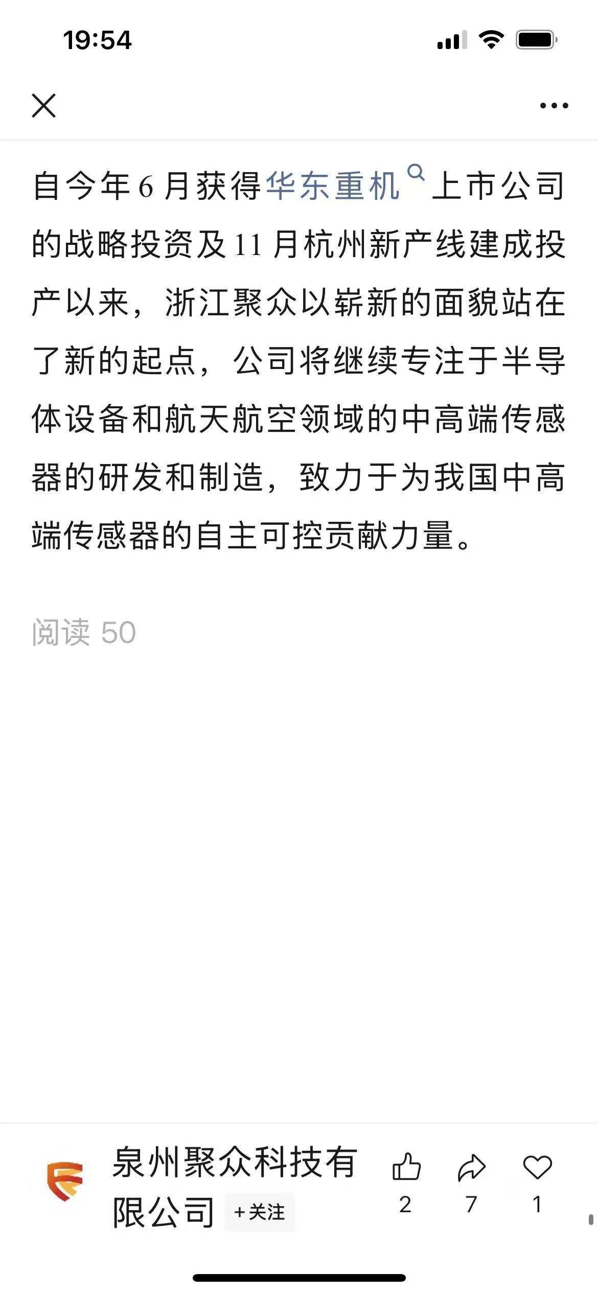 $华东重机(SZ002685)$ 聚众已迁址浙江,与西人马物理切割,聂博士意图很明显,准备重整旗鼓,以聚众为平台,再次奋发创业。聚众的发展深受华东重机实控人重视,近期实控人父子俩前往考察,应该会为聚众后续发展提供坚强后盾。聚众的中高端传感器已经在半导体设备和航空航天领域崭露头角,是当之无愧的国产NO.1。