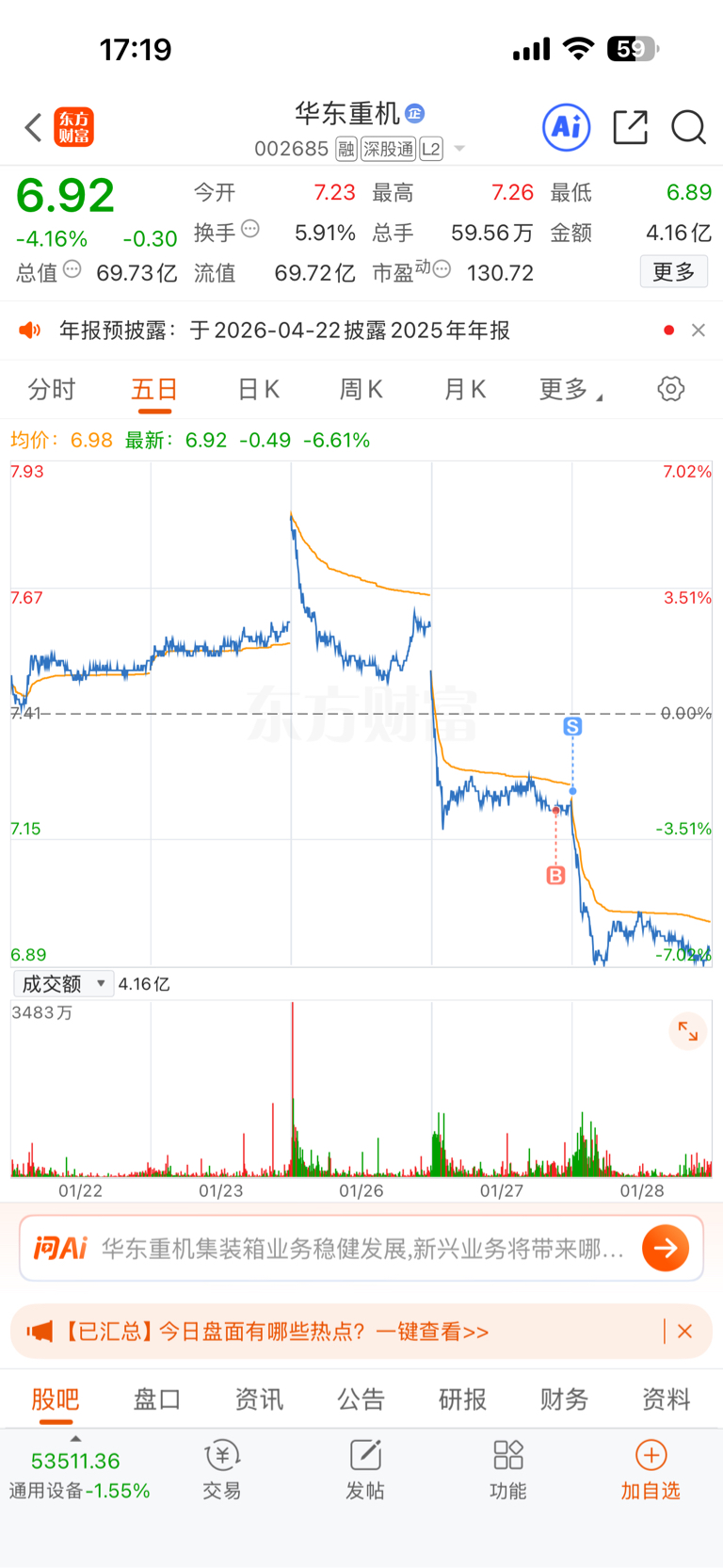 $华东重机(SZ002685)$ 赚4分
