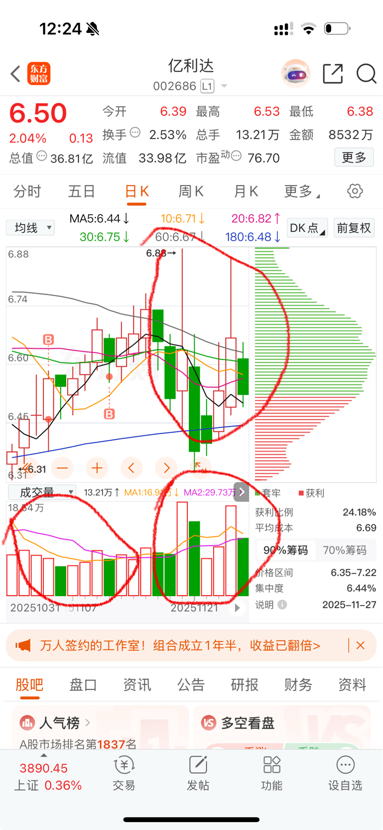 量能没有异动,暂时没有资金进场,所以不用急,先来个一成仓
