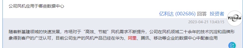 公司在风机领域二十余年的技术沉淀和品牌形象得到客户的广泛认可,目前公司生产的风机产品已经在华为、阿里、腾讯、移动等企业的数据中心中配套应用