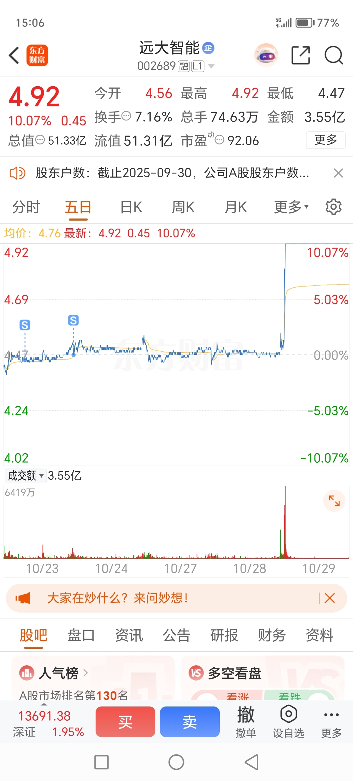 $远大智能(SZ002689)$ 被别的股票套住了。不然我是不会卖你的。前几次的涨停都吃到了。这次我痛失了。要飞天也只能看看了