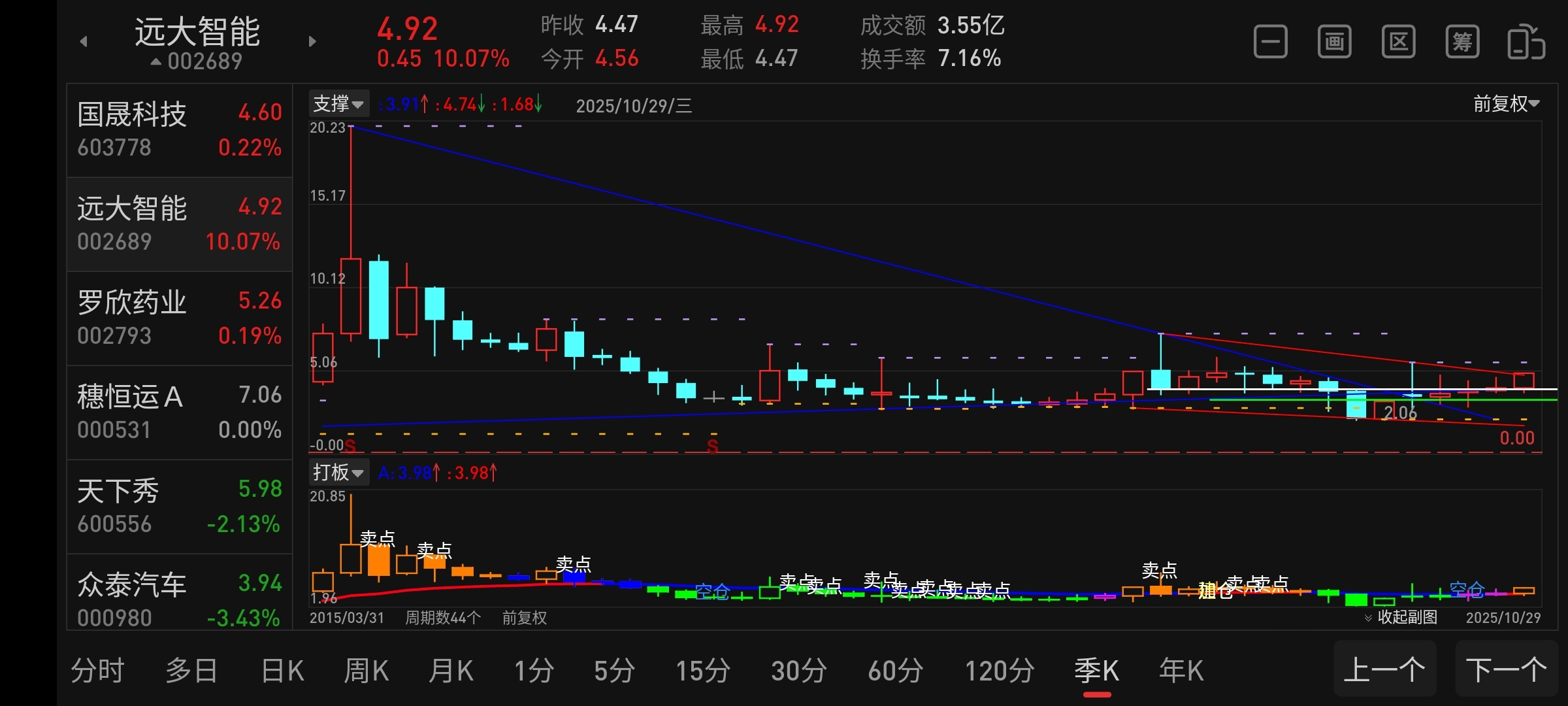 $远大智能(SZ002689)$ 季线突破趋势压力