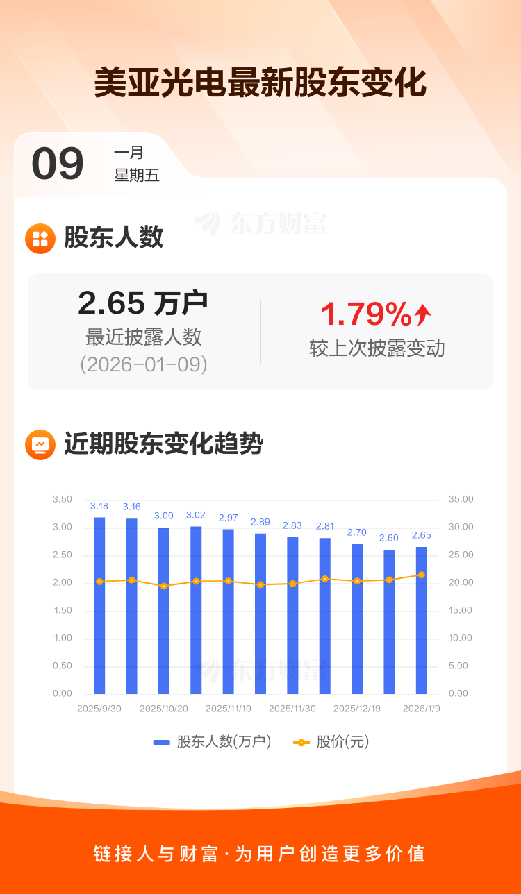 美亚光电最新披露数据显示,截至1月9日公司股东户数为2.65万户,较上期(2025年12月31日)增加466户,增幅为1.79%。户均持有流通股数量由上期的1.67万股下降至1.64万股,户均持股金额由上期的34.27万元增加至35.14万元。