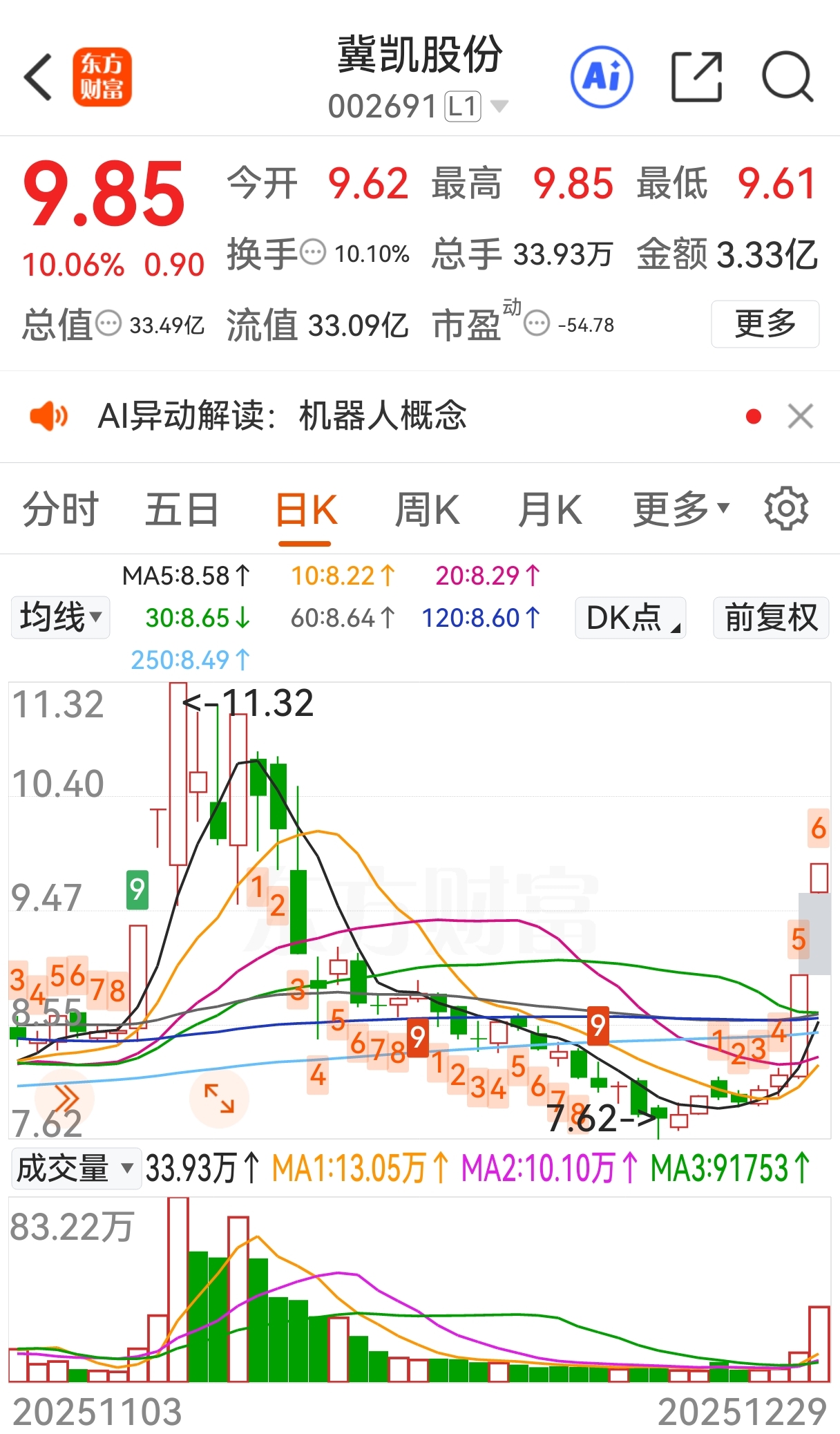 $冀凯股份(SZ002691)$ 蹭上热点概念的冀凯股份希望帮助持股人实现梦想。看图形很清晰学习到二次拉升的图形,有朋友问什么时候见顶,历史不会简单重复,但是放量滞涨要当心,参考第一次见顶。祝福持有者财源广进,期待好运者帮着长按图片投个票谢啦。