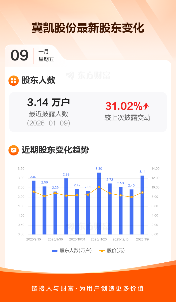 冀凯股份:截至1月9日最新股东户数3.14万户,较上期增加31.02%