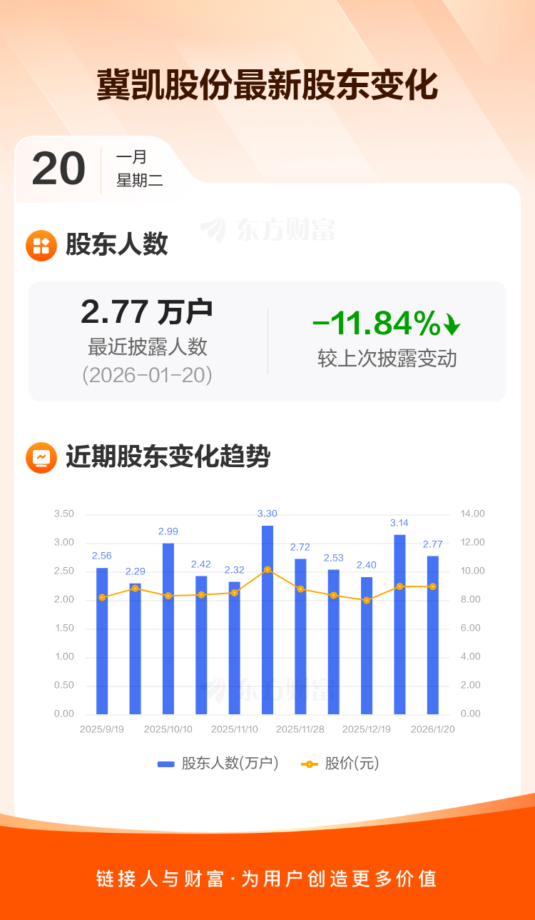 冀凯股份最新披露数据显示,截至1月20日公司股东户数为2.77万户,较上期(2026年1月9日)减少3721户,降幅为11.84%。户均持有流通股数量由上期的1.07万股上升至1.21万股,户均持股金额由上期的9.57万元增加至10.84万元。