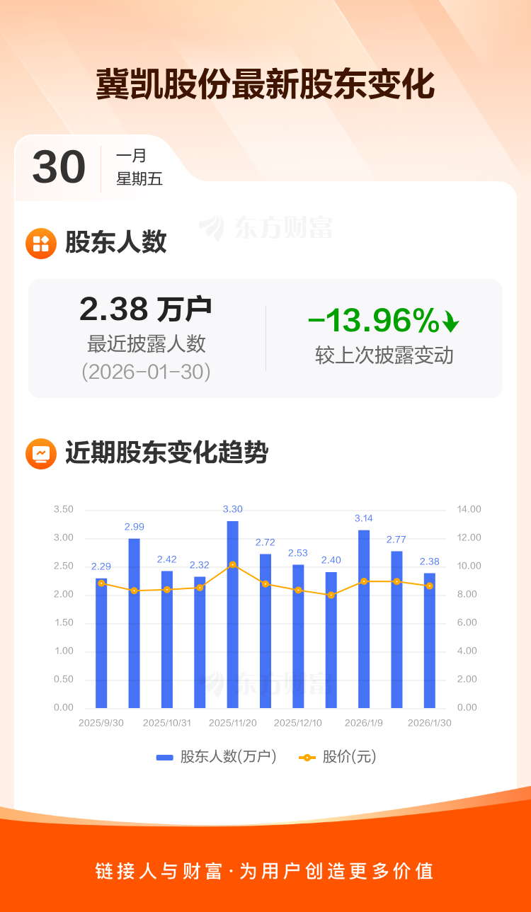 冀凯股份:截至1月30日最新股东户数2.38万户,较上期减少13.96%