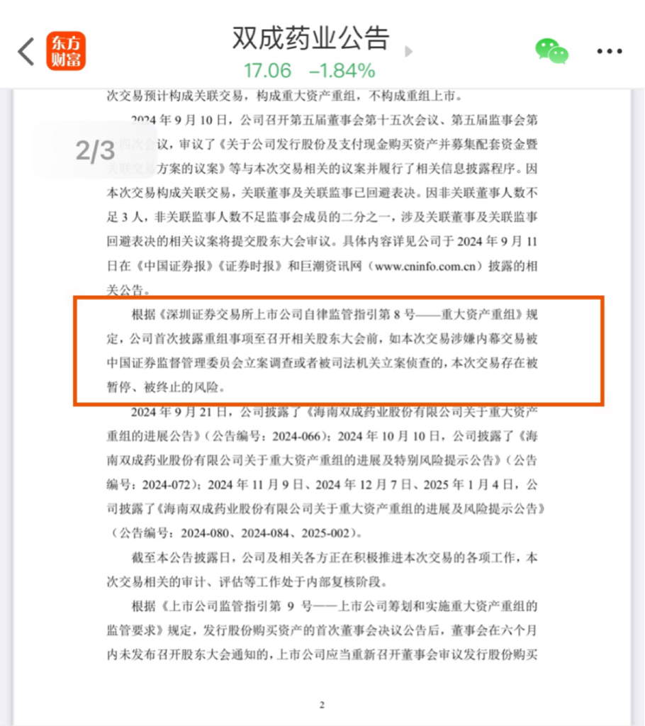 2025年1月18日双成药业发布公告称根据交易所规定:如果重组期间被查出涉嫌内幕