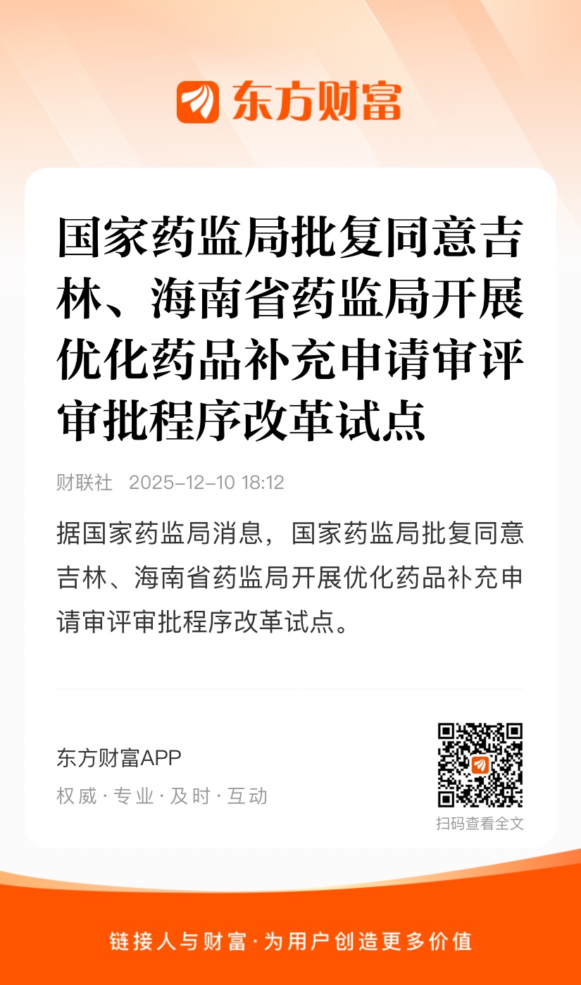 据国家药监局消息,国家药监局批复同意吉林、海南省药监局开展优化药品补充申请审评审批程序改革试点。