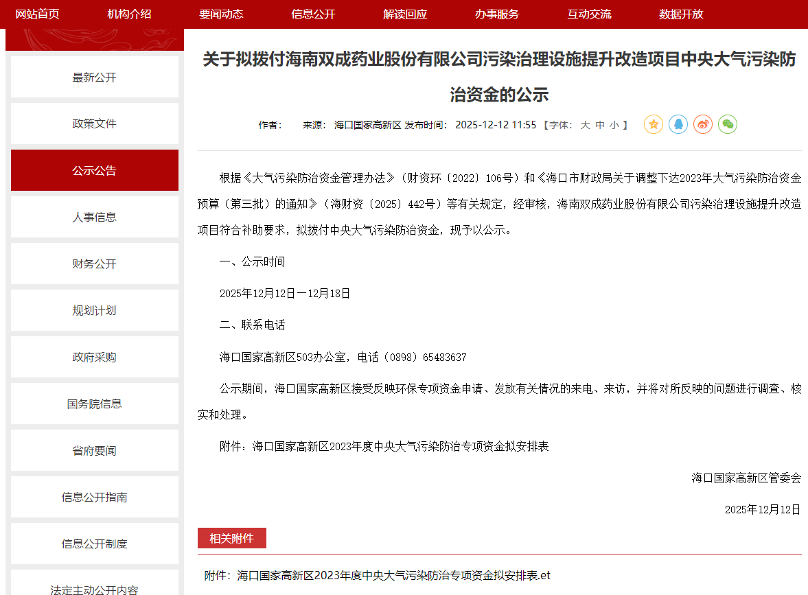 年底收到中央补贴资金160万元!海南双成药业股份有限公司污染治理设施提升改造项目