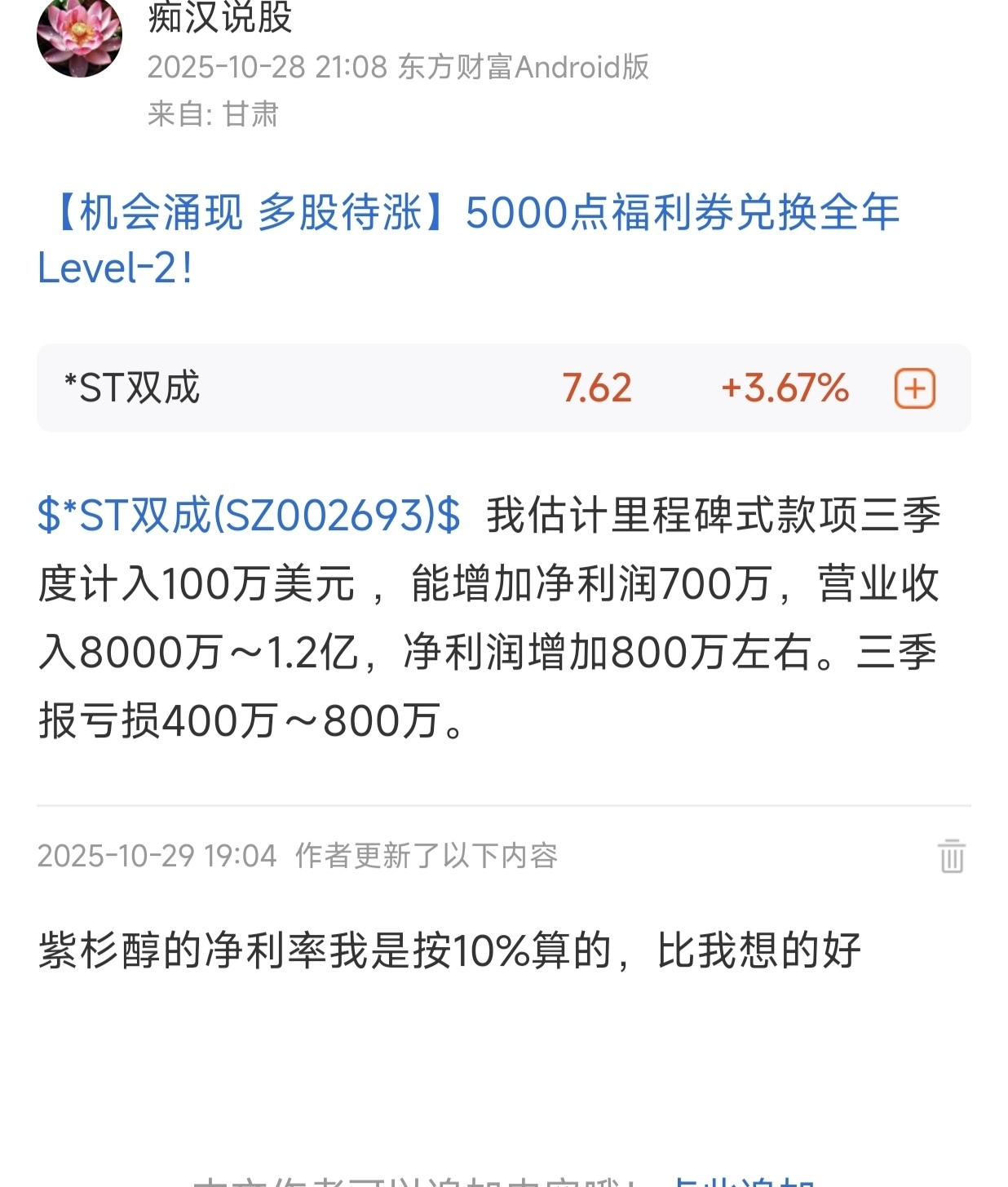 这是我预测的双成三季报,年报我也预测了,自己去看我以前的帖子。四季度紫杉醇销售8