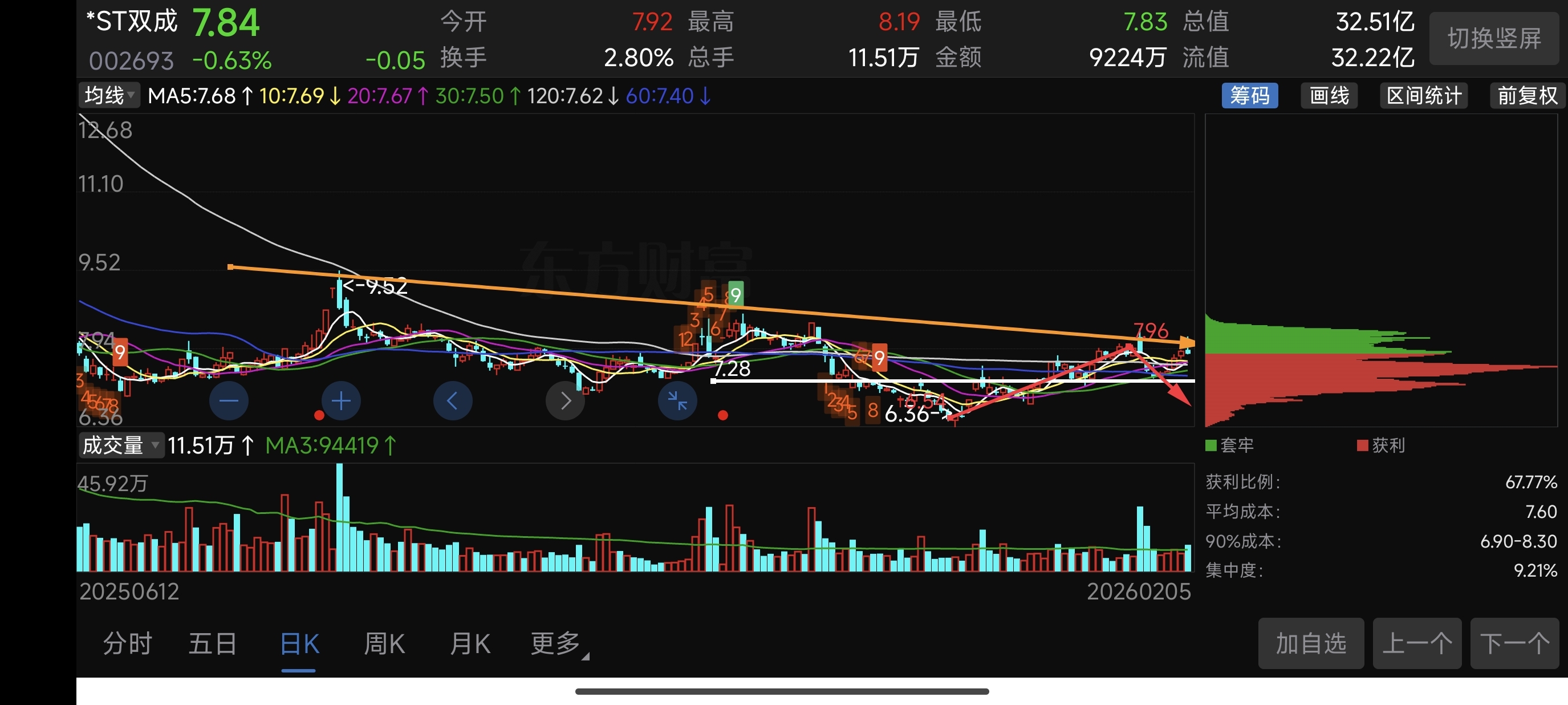 $*ST双成(SZ002693)$ 又到了我上次画的图压力位了,现在还是二浪回调的B浪反弹阶段,接下来就是二浪里的C浪下跌阶段,然后开启三浪反弹阶段,这次上去就会突破8.56的高点。C浪回调,看这两天的走势应该回调幅度不会太大。