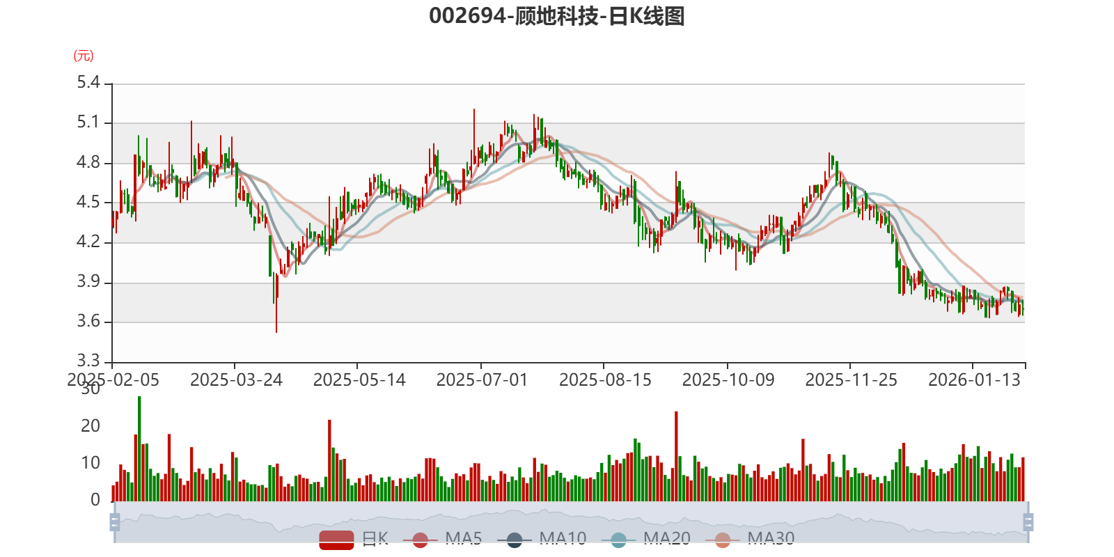 中证智能财讯顾地科技(002694)1月30日晚间披露2025年度业绩预告,预计2025年归母净利润亏损3亿元至5.77亿元,上年同期亏损1.53亿元;扣非净利润亏损6320.85万元至1.23亿元,上年同期亏损1.55亿元;基本每股收益-0.42元/股至-0.8元/股。以最新收盘价计算,市净率(LF)约26.85倍,市销率(TTM)约3.21倍。
