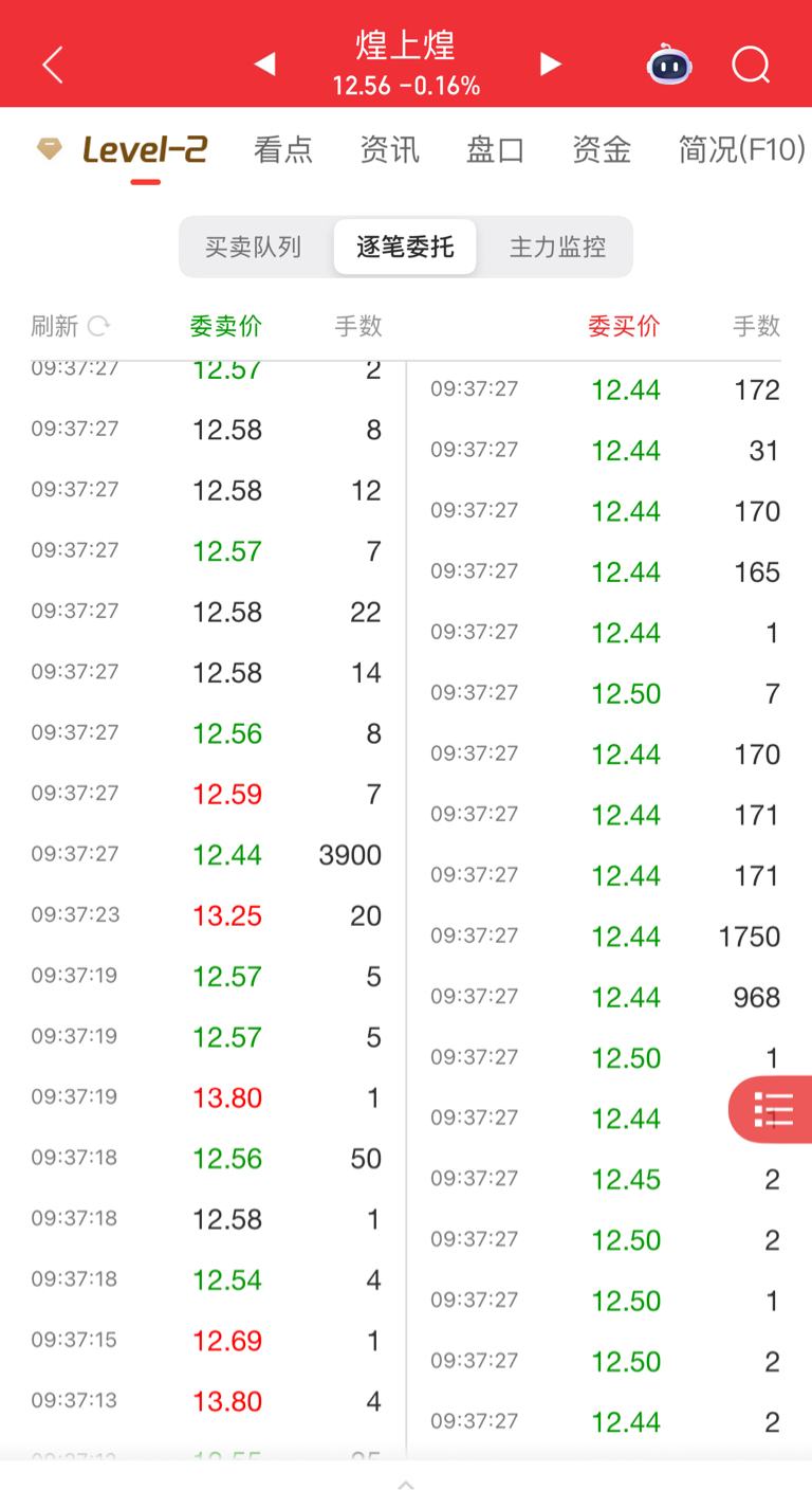 $煌上煌(SZ002695)$ 都是在左右手互倒在诱多出货,看看12.44这个价格,委卖和委买挂单时间都一样,提醒很多次,注意风险!