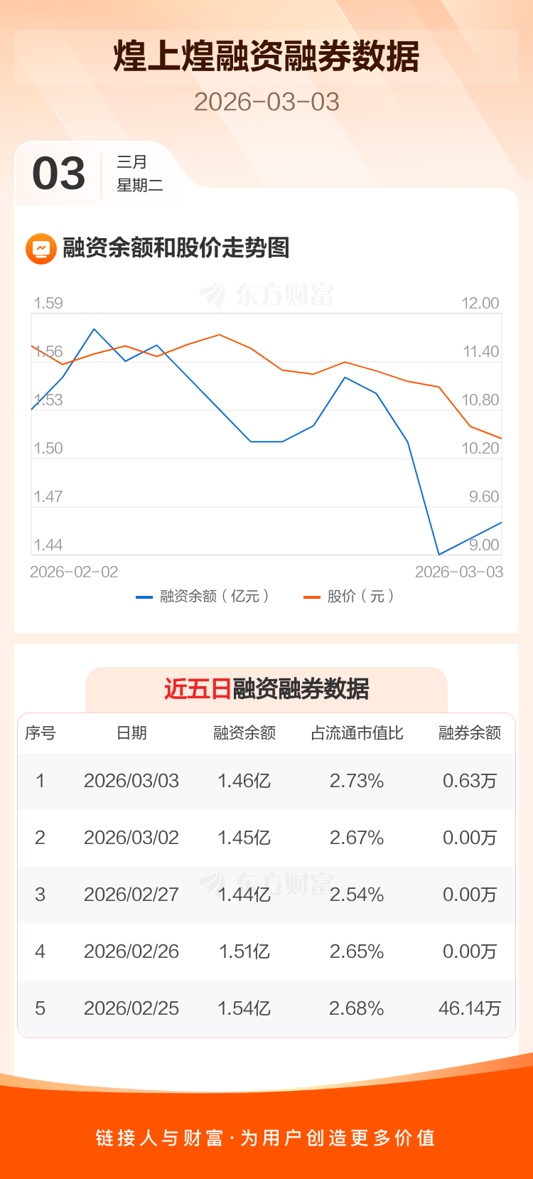 交易所最新数据显示,煌上煌于2026年3月3日获融资买入625.68万元,融资偿还543.33万元,当日融资净买入82.35万元。目前,该股融资余额1.46亿,占流通市值比例为2.73%。