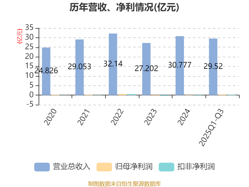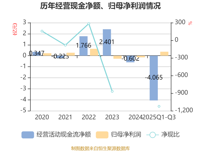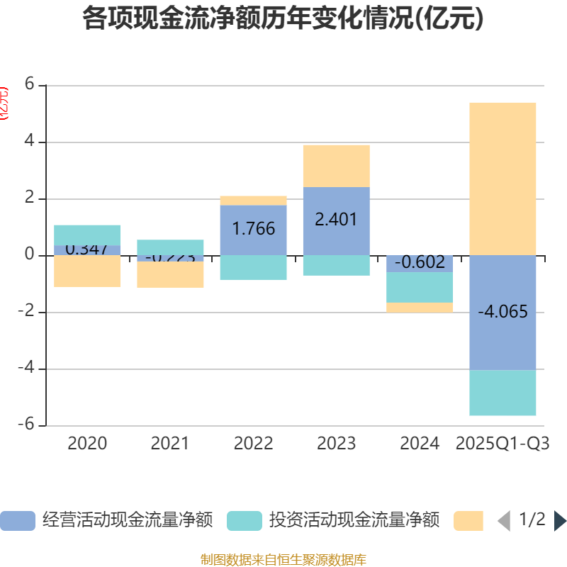 2025年前三季度,公司经营活动现金流净额为-4.06亿元,同比减少3.32亿元;筹资活动现金流净额5.38亿元,同比增加4.05亿元;投资活动现金流净额-1.6亿元,上年同期为-5978.05万元。