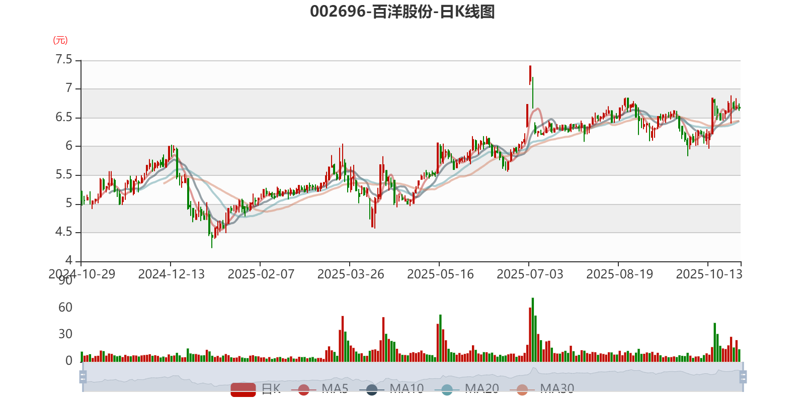中证智能财讯百洋股份(002696)10月29日披露2025年第三季度报告。前三季度公司实现营业总收入29.52亿元,同比增长38.77%;归母净利润3612.8万元,同比扭亏;扣非净利润2756.31万元,同比扭亏;经营活动产生的现金流量净额为-4.06亿元,上年同期为-7421.62万元;报告期内,百洋股份基本每股收益为0.1元,加权平均净资产收益率为2.63%。
