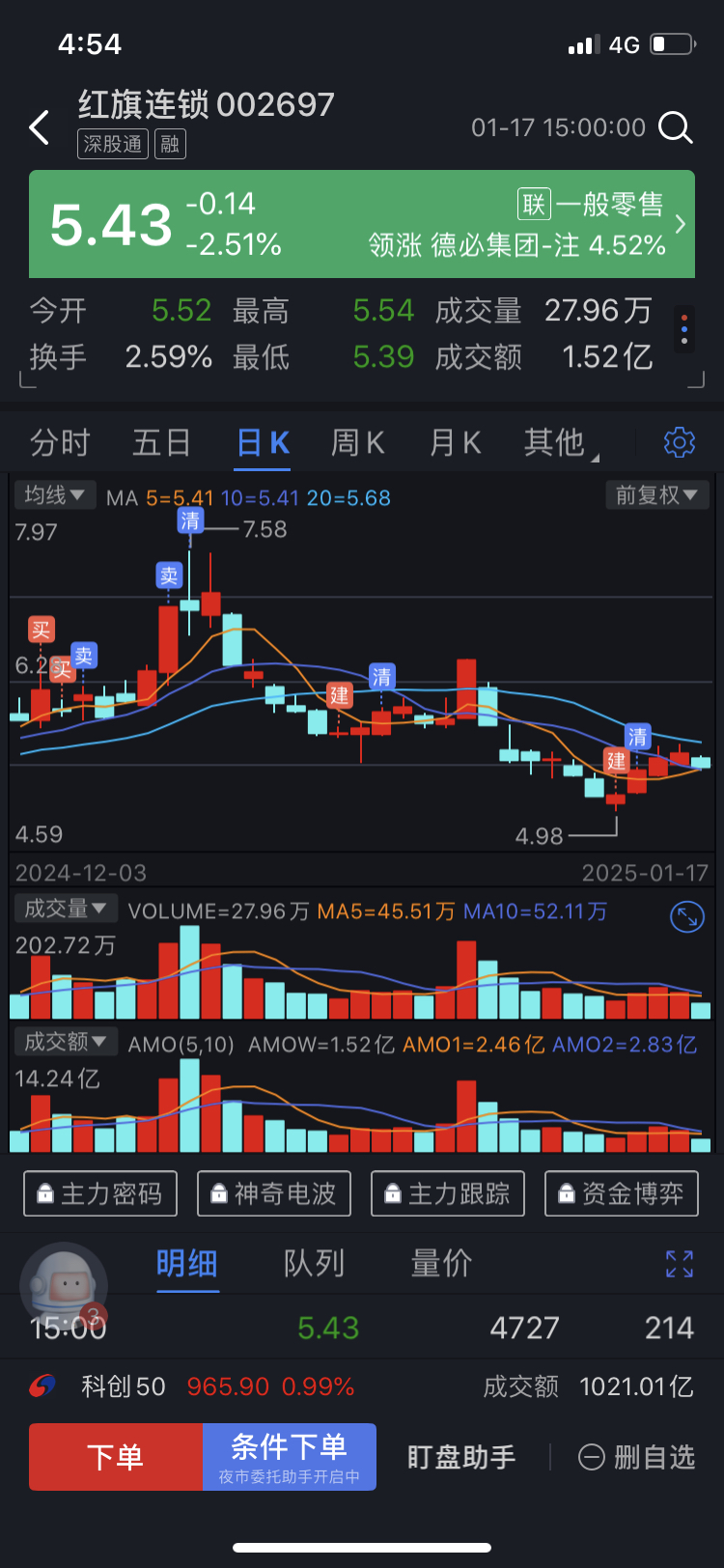 $红旗连锁(SZ002697)$ 耐心等回落到5.14元建仓。