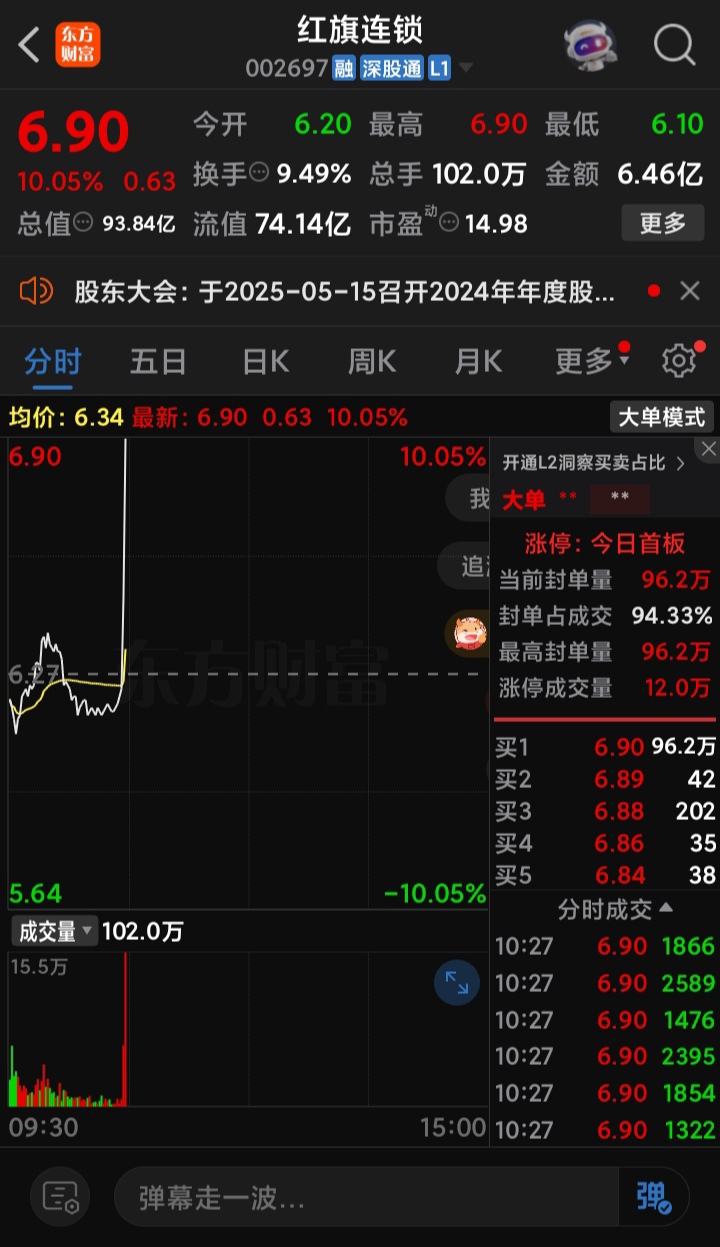 红旗连锁是我昨天重点介入的一只股,今天迎来涨停,不错