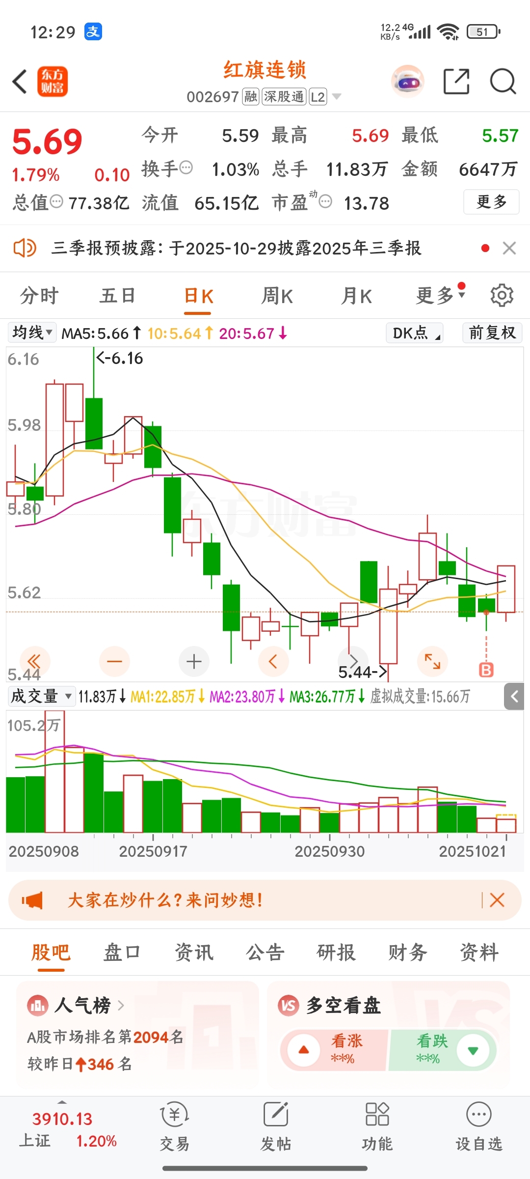 $红旗连锁(SZ002697)$ 下午放量涨点吧。