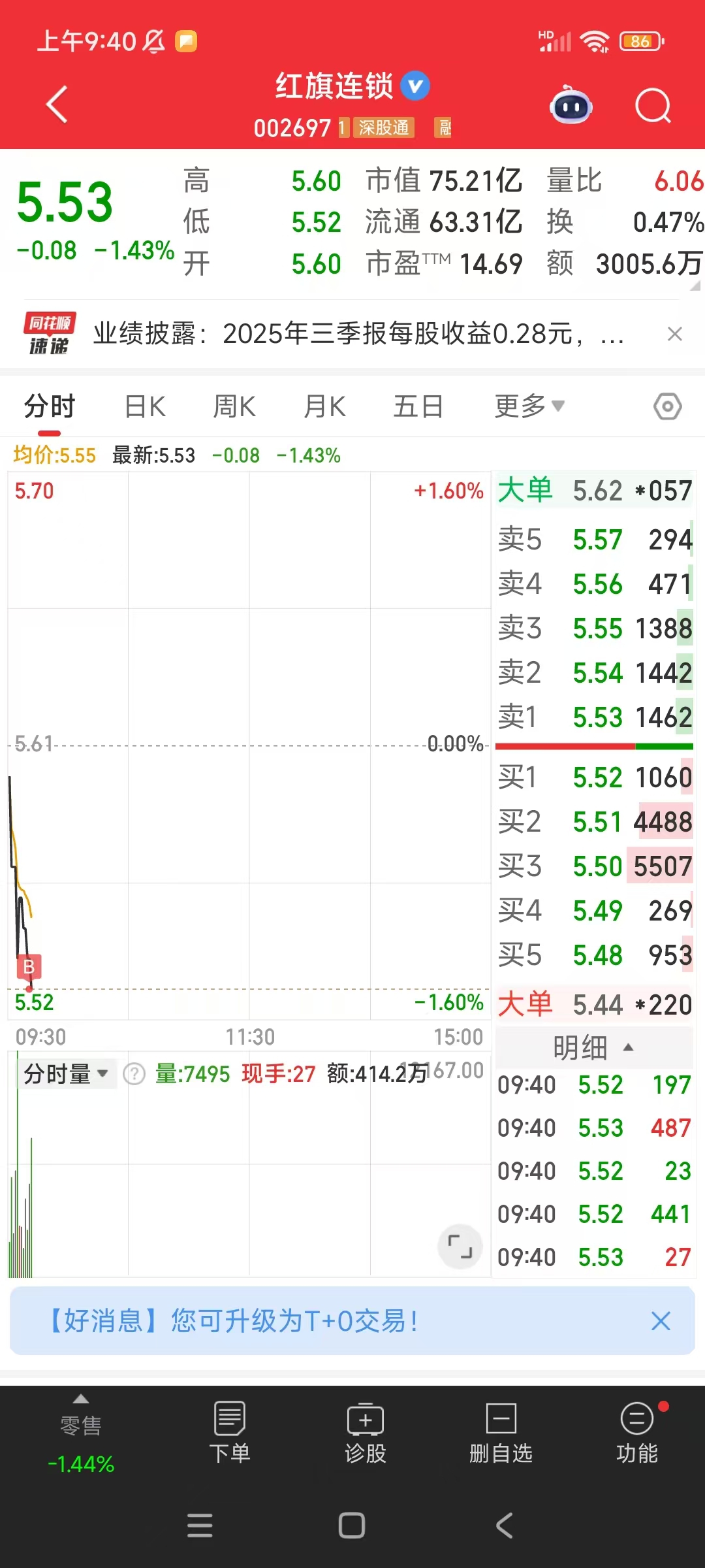 $红旗连锁(SZ002697)$ 5.53买1/4仓,抄底太急了