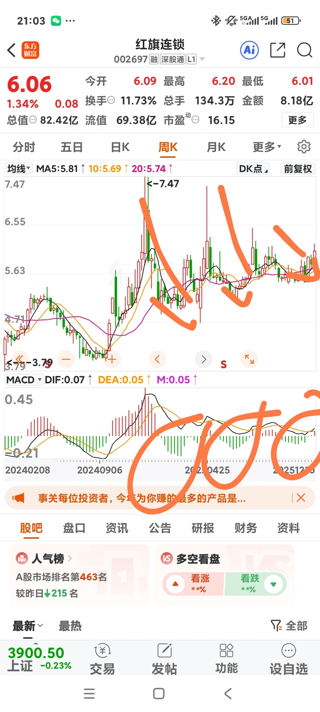 $红旗连锁(SZ002697)$ 炒股格局要大。看周线级别更清晰。哈哈!