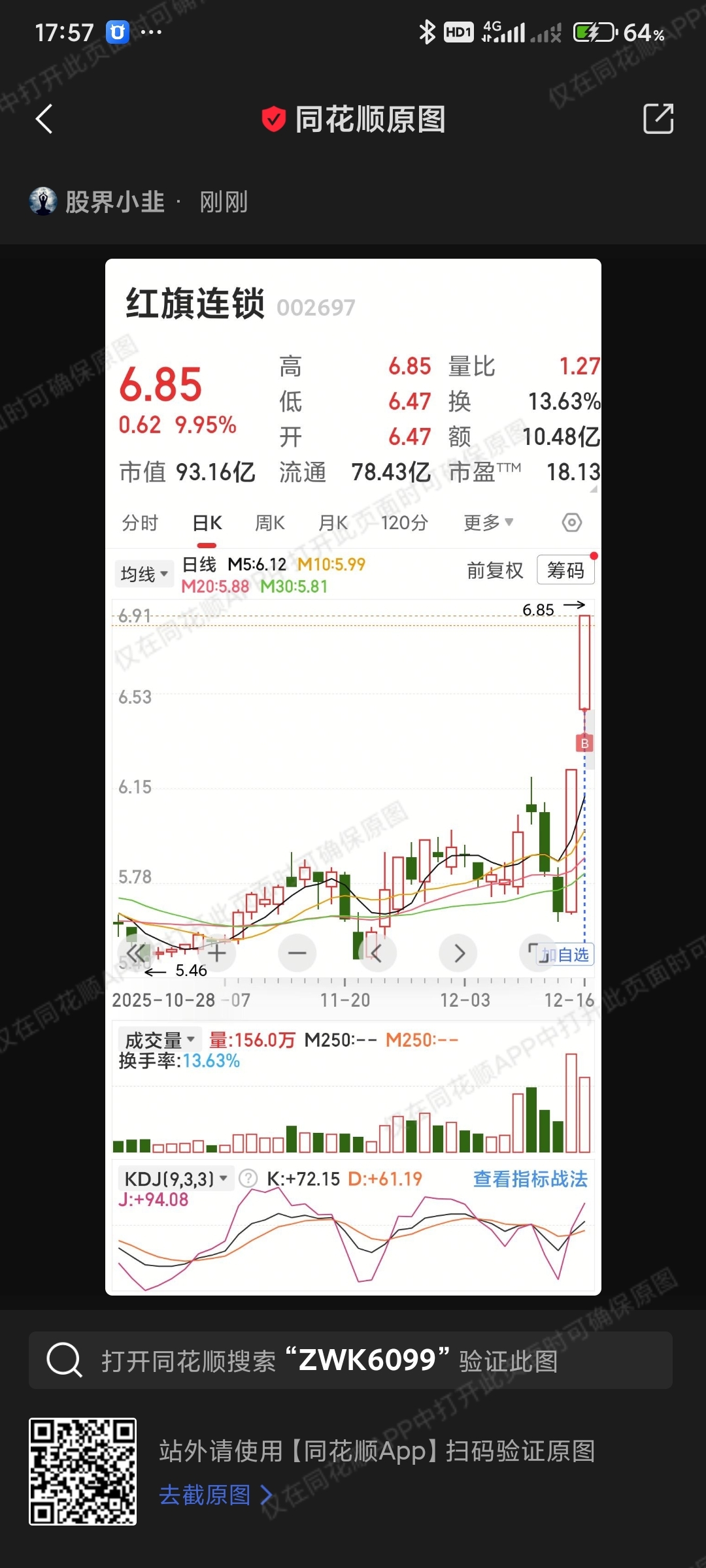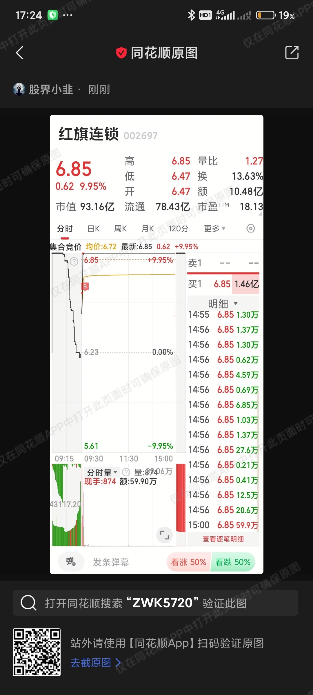 $红旗连锁(SZ002697)$ 竞价打连板,一打就上板,运气满满满!只要功夫深,铁杵磨成针!