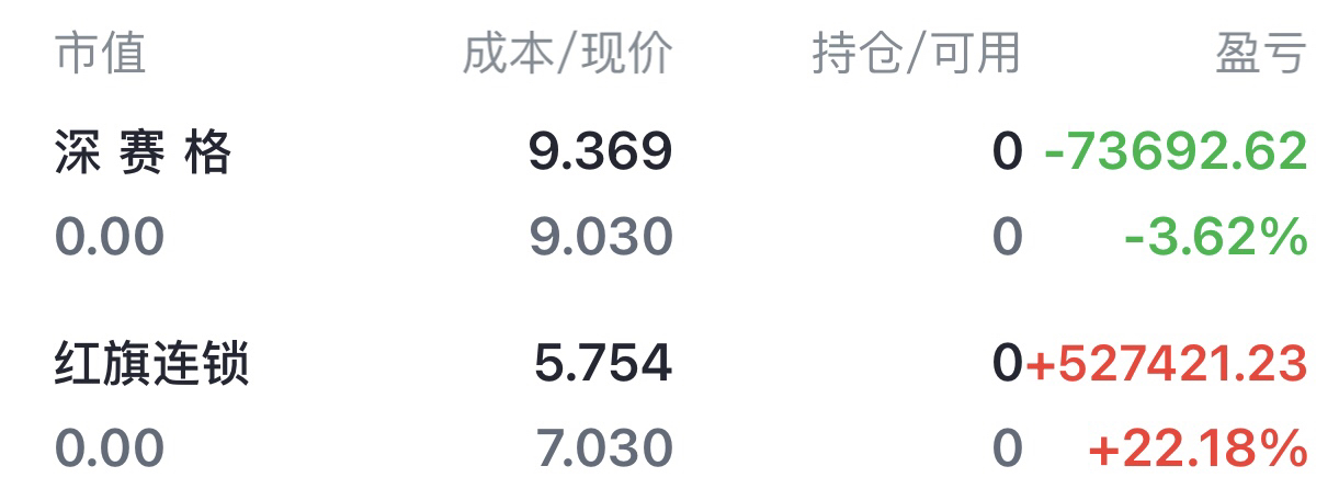 $红旗连锁(SZ002697)$ $深 赛 格(SZ000058)$ 买入第三日清了,感谢!我要休息一下了
