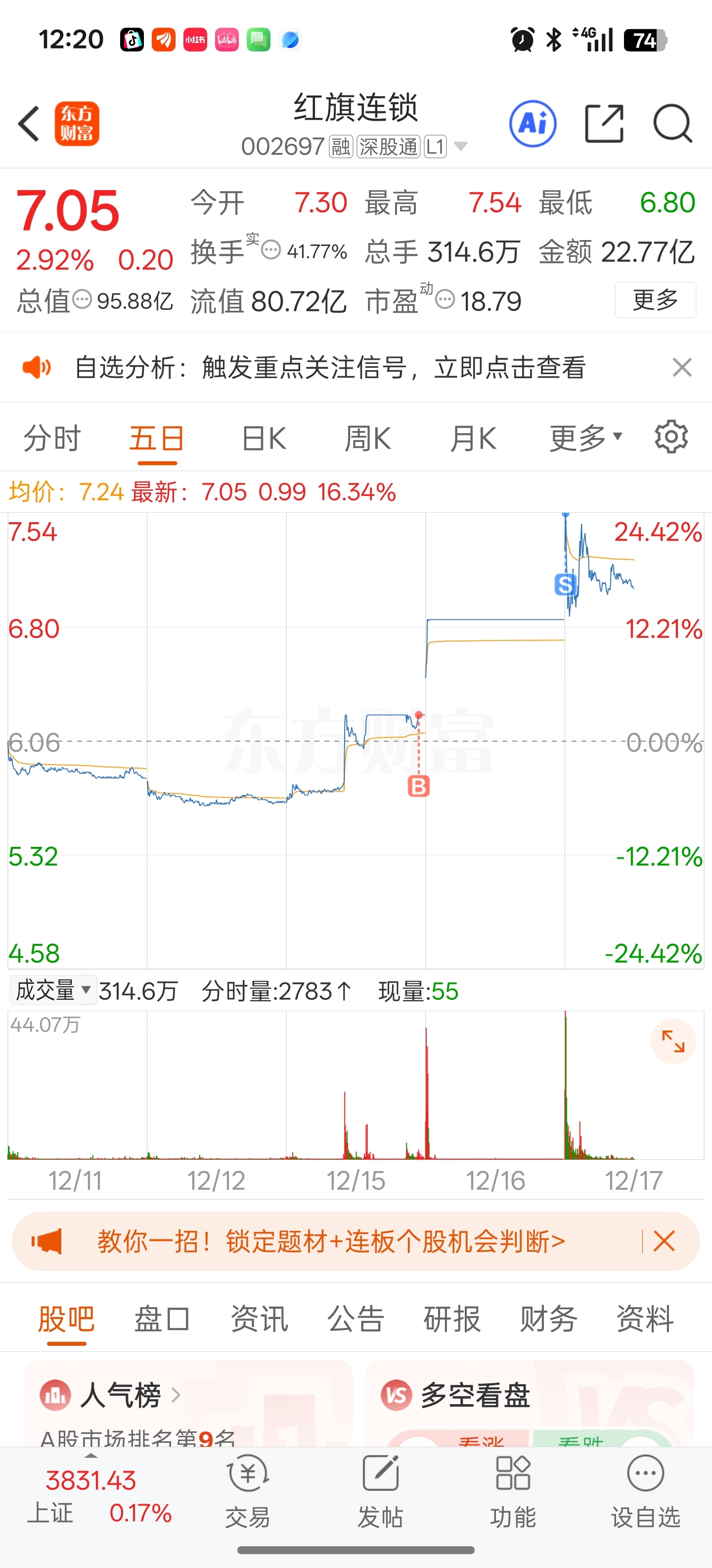 $红旗连锁(SZ002697)$ 没那么多涨停,别幻想,冲高就跑