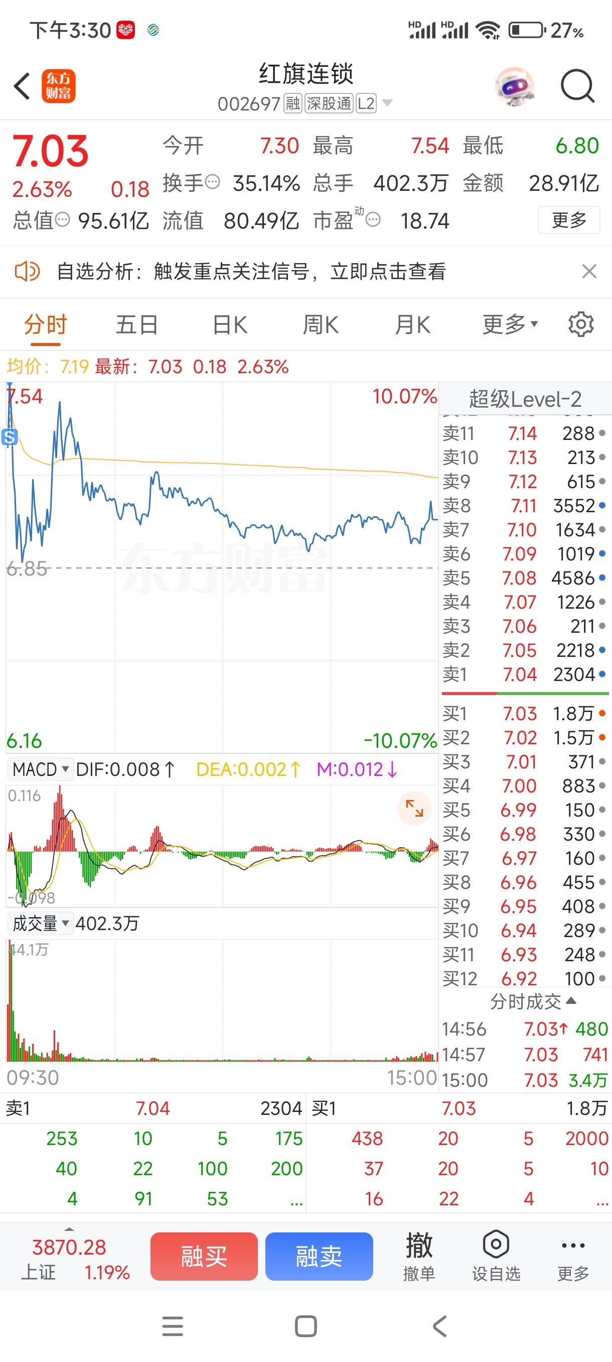 $红旗连锁(SZ002697)$ 现在这种行情,就不能格局,特别是这种带融资的小盘股,见好就收!今天这只股人气这么高,主力全天给你大量时间可以在3%以下买入,会那么好心让你抄底吗,今天换手率太高,量放得很大,个人判断暂时上涨概率不大了。
