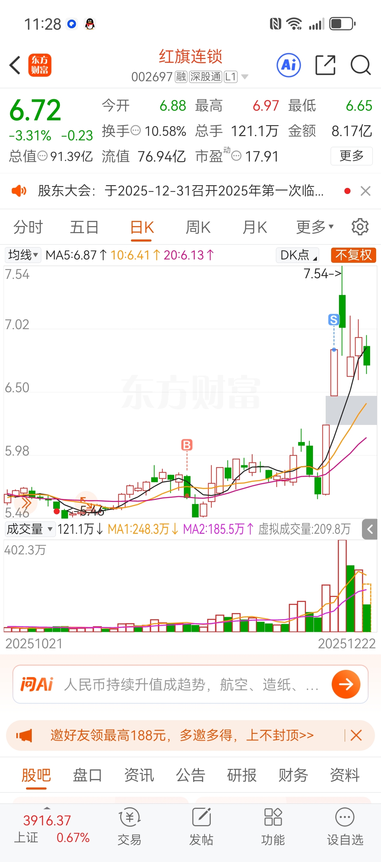 $红旗连锁(SZ002697)$ 5块多我来接你