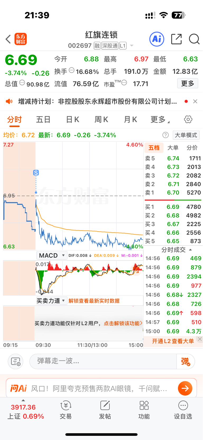 $红旗连锁(SZ002697)$ 侥幸谈过一劫,还剩一层仓,无所谓了