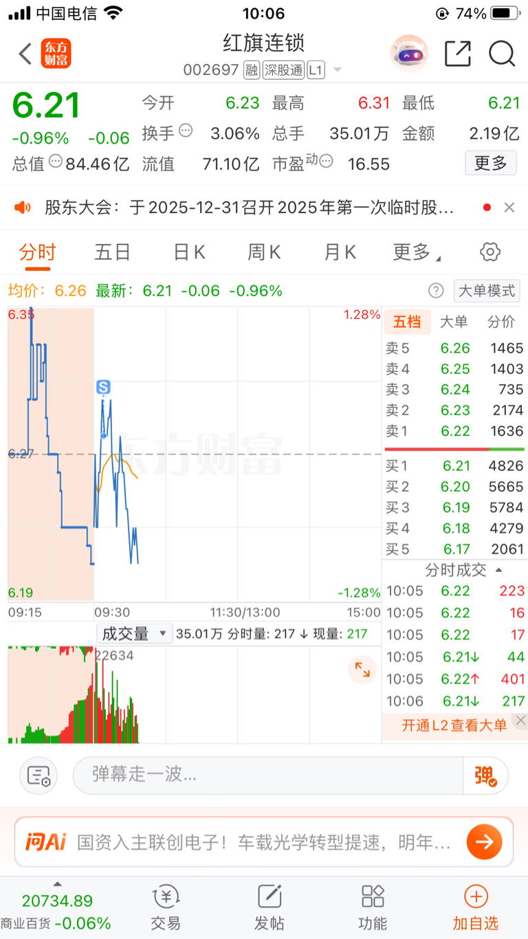 $红旗连锁(SZ002697)$ 情况不对我就撤,这个票没亏没赚,还是杂毛了上不去。