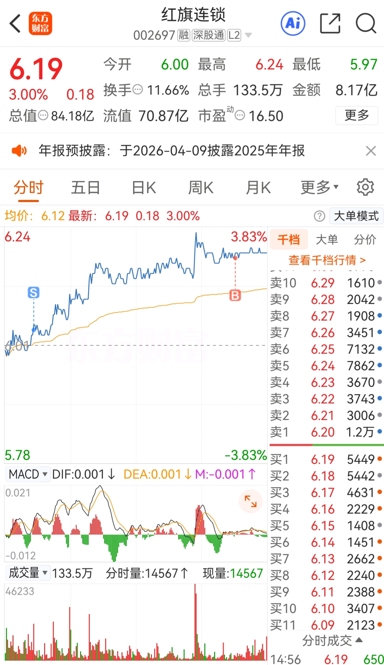 $红旗连锁(SZ002697)$ 今天妥妥卖飞,又追高!