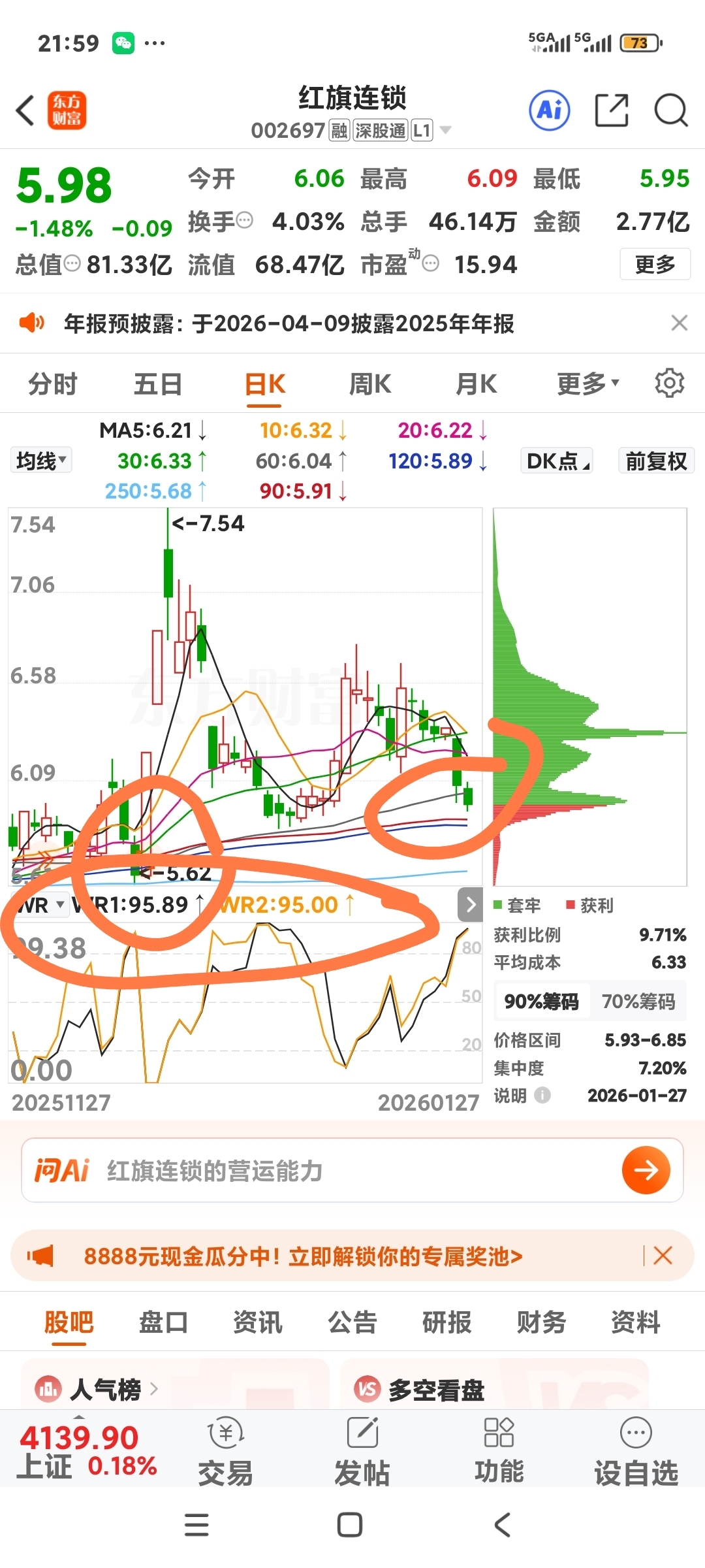 $红旗连锁(SZ002697)$ 威廉指标再次超卖。哈哈!